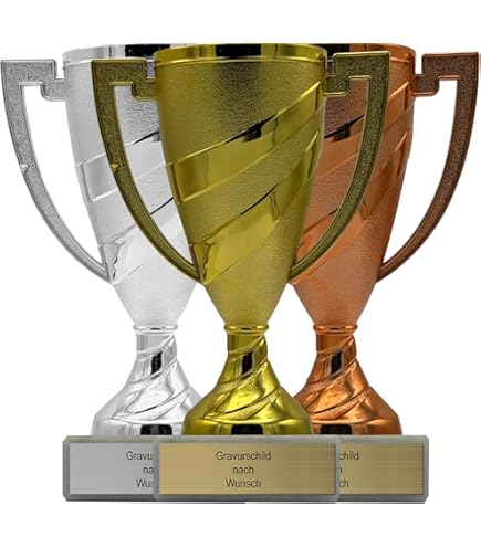 Hey, mach deine Sieger glücklich mit diesen niedlichen Mini-Pokalen! Das 3er-Set für Platz 1, 2 und 3 in Gold, Silber und Bronze - jeder nur 11cm hoch und superleicht (ca. 30g). Perfekt für Kindergeburtstage, Vereinsfeste, Garten-Olympiade oder Spieleabende mit Freunden. Die Pokale kommen schon mit montiertem Gravurschild - da kannst du Namen, Datum oder nen coolen Spruch reinschreiben lassen. Aus stabilem Kunststoff, aber sehen aus wie echt! Die glänzende Oberfläche macht was her, und die kleinen Hände können die Trophäen gut halten. Einfach auspacken und überreichen - die Augen werden strahlen! Ob fürs Kegelturnier, Schulwettbewerb oder einfach so: Mit diesen Pokalen wird jede Auszeichnung zum besonderen Erinnerungsstück.