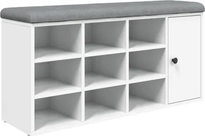 Ordnung im Flur war noch nie so bequem! Diese praktische Sitzbank in Weiß bietet nicht nur eine gemütliche Sitzgelegenheit zum Schuhe anziehen, sondern auch jede Menge Stauraum drunter. Mit den Maßen 102x32x50cm passt sie perfekt in jeden Flur oder Eingangsbereich. Das dick gepolsterte Kissen in Hellgrau ist superbequem und der Holzwerkstoff robust und feuchtigkeitsbeständig. Bis zu 110kg trägt die Bank problemlos. Ob als Schuhbank, Aufbewahrungsmöbel oder einfach nur als Sitzgelegenheit - sie macht in jedem Zuhause eine gute Figur. Einfach zusammenbauen und sich über mehr Ordnung freuen!