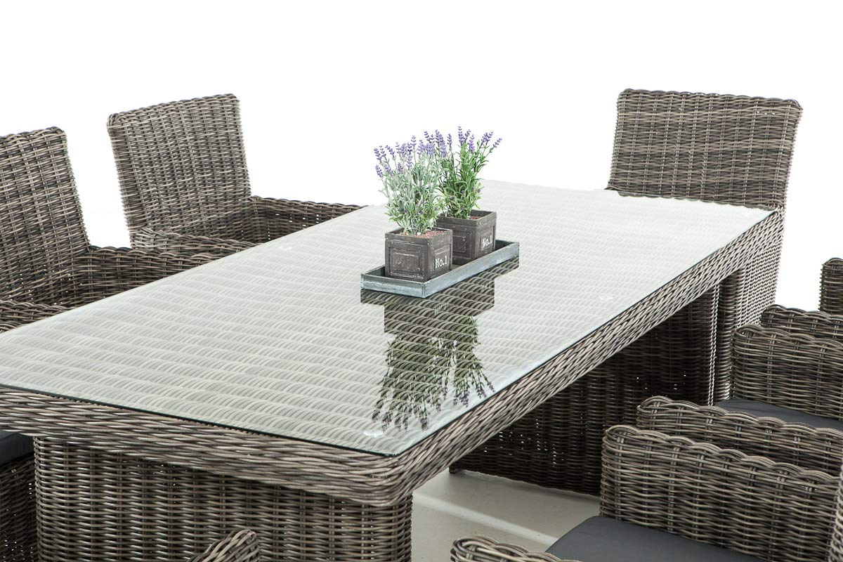 Wow, was für ein Traum-Gartenset! Die CLP Fontana Sitzgruppe bringt richtig viel Stil in deinen Garten. Mit einem großen Esstisch (180x90x75cm) und sechs superbequemen Sesseln hast du alles, was du für gemütliche Stunden im Freien brauchst. Die Polyrattan-Optik sieht nicht nur edel aus, sondern ist auch total pflegeleicht, wasserfest und UV-beständig - perfekt für deutschen Sommer! Die 5,5cm dicken Polsterauflagen in Cremeweiß sind schon dabei und machen das Sitzen zum absoluten Genuss. Die ergonomisch geformten Rückenlehnen und erhöhten Armlehnen sorgen für maximalen Komfort. Der Tisch mit seiner 5mm Sicherheitsglasplatte und den rutschfesten Gumminoppen ist ideal für gesellige Runden. Das stabile Aluminiumgestell unter dem Geflecht garantiert Langlebigkeit. Die Bezüge der Kissen kannst du einfach abnehmen und waschen - praktisch, oder? Ob für Familienfeiern, Grillabende oder einfach nur zum Entspannen - dieses Set ist ein echter Hingucker! Einfach aufbauen und den Sommer genießen!