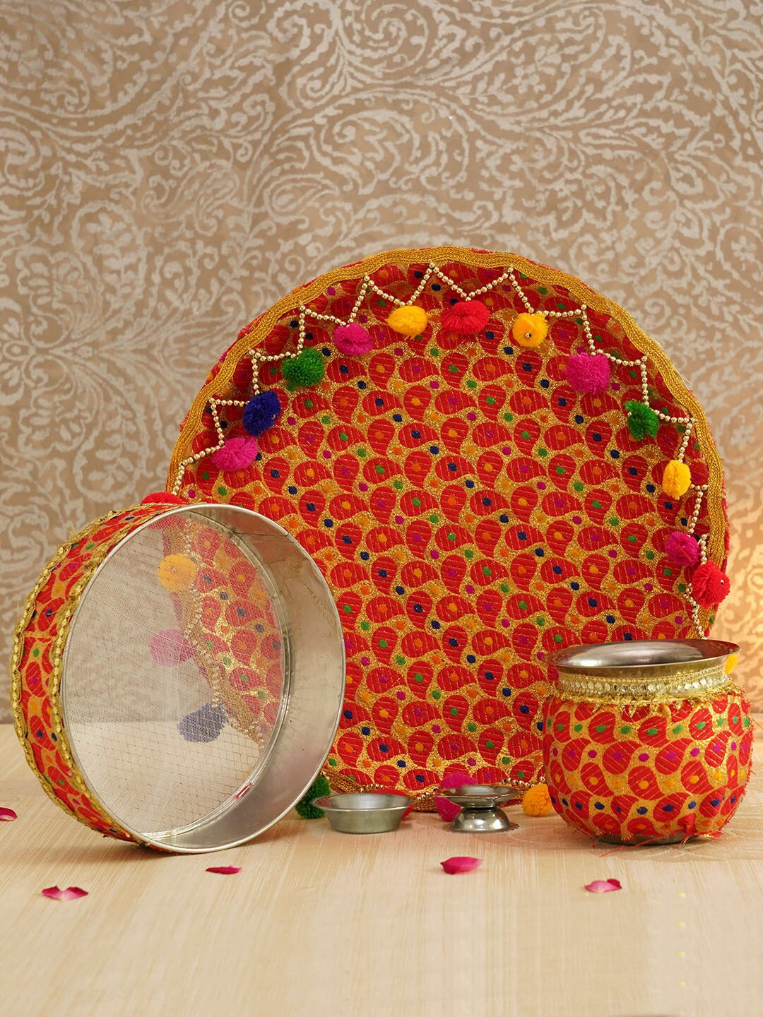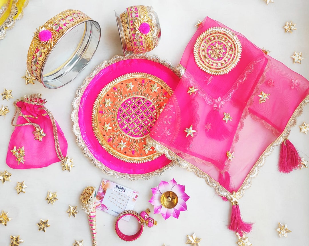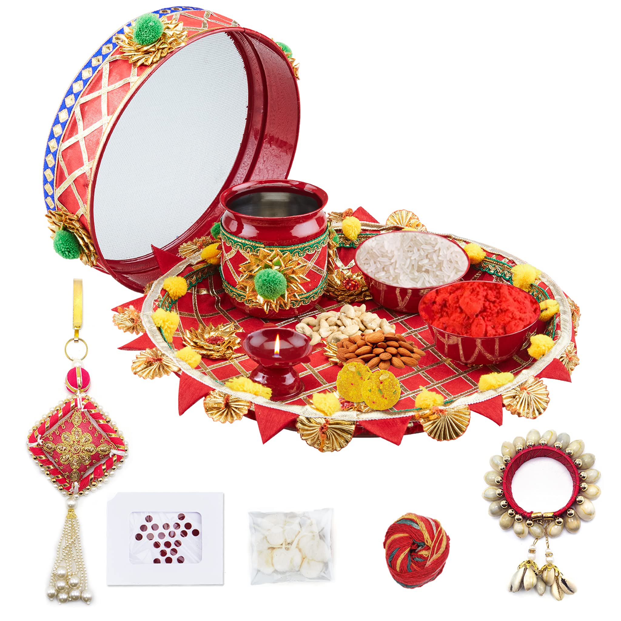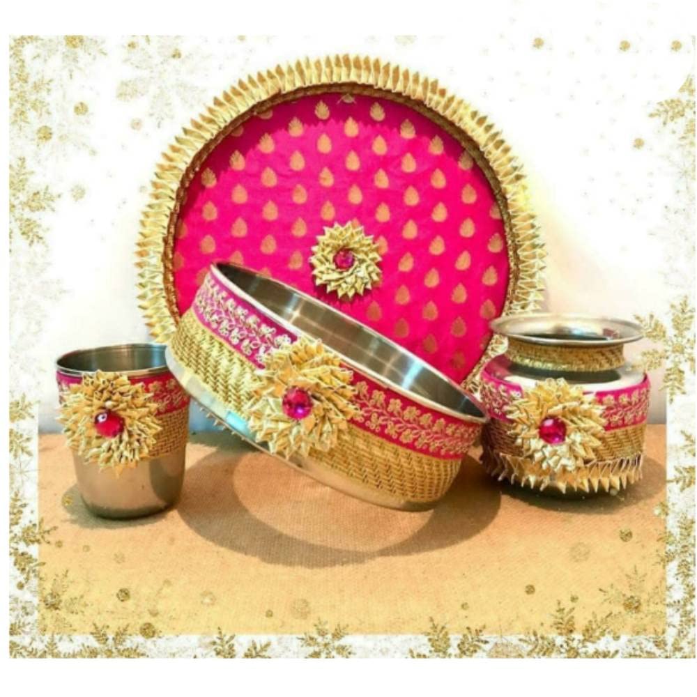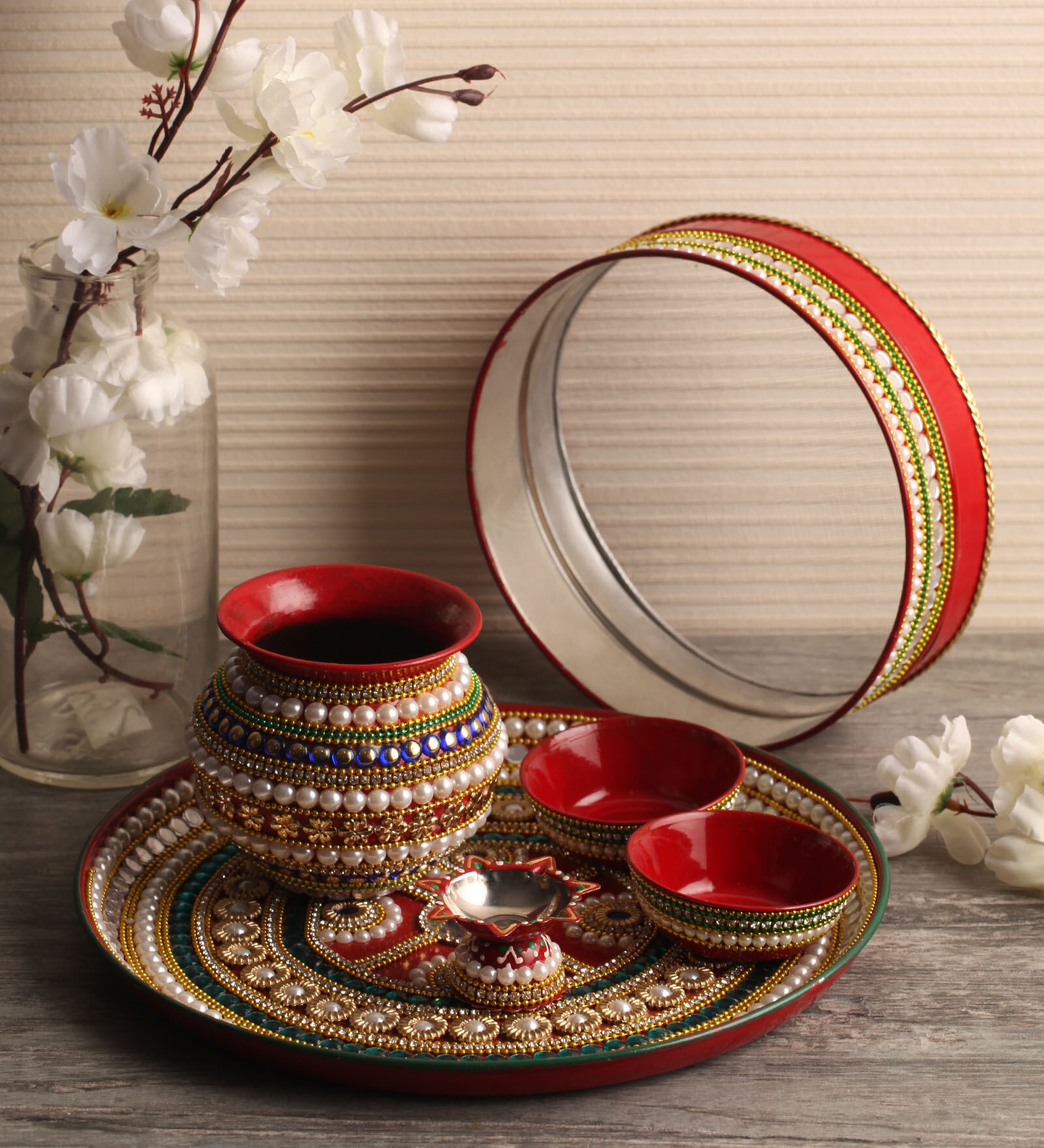 Für alle, die das Karwa Chauth Fest traditionell feiern möchten! Dieses wunderschöne 5-teilige Pooja Thali Set von BRACOP ist einfach perfekt. Enthalten sind: 1 Pooja Thali (Durchmesser 28 cm, Tiefe 2,5 cm), 1 Lota (Wasserbehälter), 1 Channi (Sieb), 1 Diya (Öllampe) und 1 Glas. Hergestellt aus hochwertigem Edelstahl in mehrfarbigen, traditionellen Designs. Das Thali ist nicht nur praktisch für die Gebetszeremonie, sondern auch ein echter Hingucker als Deko-Stück. Perfekt als Geschenk für Frauen, zur Hochzeit oder für jeden besonderen Anlass. Kann auch super als Schmuck-Organizer, Sindoor-Etui oder für die Schminktisch-Dekoration verwendet werden. Die liebevolle Handarbeit sieht man jedem Detail an - von den feinen Verzierungen bis zur hochwertigen Verarbeitung. Ein Stück Tradition für Zuhause, das Generationen überdauert. Ob für den eigenen Gebrauch oder als Geschenk - dieses Thali Set begeistert garantiert!