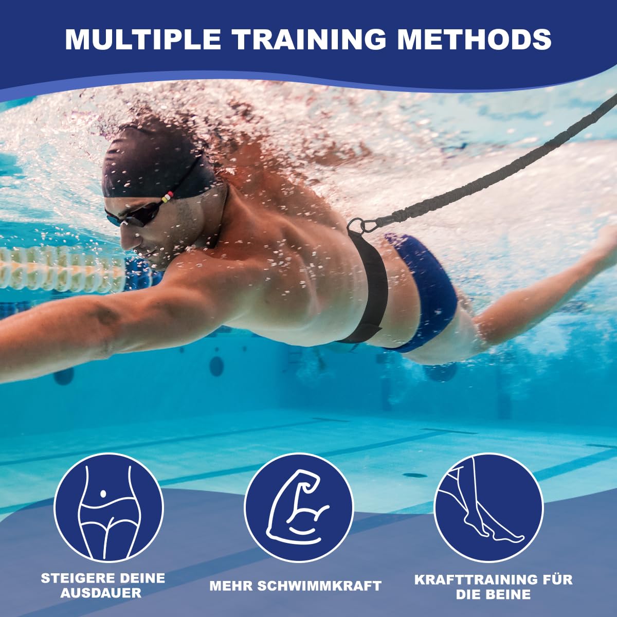 Professionelles Schwimmtraining für zu Hause! Dieser verstellbare Schwimmgurt ist perfekt für Pool und Gegenstromanlagen. Das Set enthält Schwimmgurt, 7,5m langes Spannseil und Gürtelkissen. Das elastische Seil dehnt sich bis 7,5 Meter und bietet variablen Widerstand für effektives Training. Ideal zur Verbesserung von Schwimmgeschwindigkeit und Ausdauer. Einfach um die Taille binden und am Pool befestigen. Geeignet für Erwachsene und Kinder ab 7 Jahren. Perfekt für Hotels, Kreuzfahrten oder den heimischen Pool. Steigere deine Schwimmleistung mit diesem praktischen Trainer!