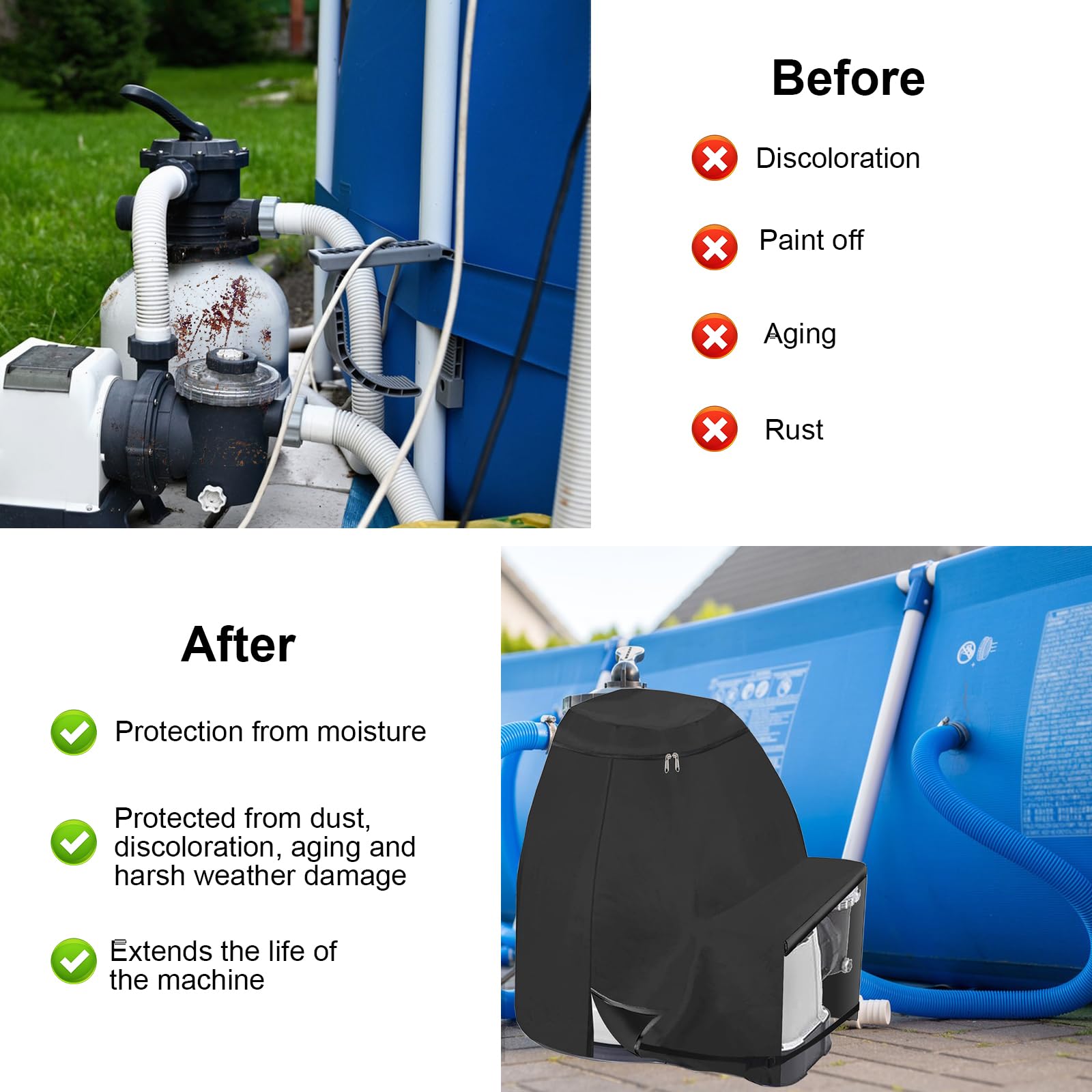 Deine Poolpumpe verdient den besten Schutz! Diese robuste Abdeckung aus 420D Oxford-Gewebe hält Regen, Sonne und Staub zuverlässig ab. Mit den Maßen 64x61x71cm passt sie perfekt auf die meisten Standard-Sandfilterpumpen. Das geniale Detail: verstellbare Reißverschlüsse an der Unterseite sorgen für einen perfekten Sitz - egal bei welchem Pumpenmodell. Einfach über die Pumpe stülpen, Reißverschlüsse anziehen und schon ist deine teure Technik sicher verpackt. Nach der Poolsaison lässt sich die Abdeckung ganz easy zusammenfalten und platzsparend verstauen. Wichtig: Immer komplett trocken lagern, dann hält sie viele Jahre. Die wasserabweisende Beschichtung macht sie zum idealen Begleiter für jede Witterung. Kein lästiges Abdecken mit Planen mehr - diese maßgeschneiderte Lösung sieht nicht nur ordentlicher aus, sondern schützt auch viel besser. Einfach mit Wasser abspülen oder mit einem feuchten Tuch abwischen - die Reinigung geht ratzfatz. Deine Poolpumpe bleibt in Top-Zustand und du hast länger Freude an deinem Pool!