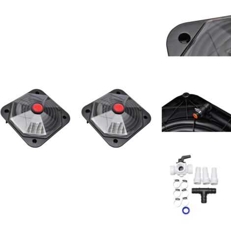 Im Lieferumfang findest du alles, was du brauchst: 2 Sonnenkollektoren, 3-Wege-Ventile, D-Schlauch-Anschlüsse, Adapter, Schlauchschelle und Teflonband. Maße pro Kollektor: 71,5 x 71,5 cm.