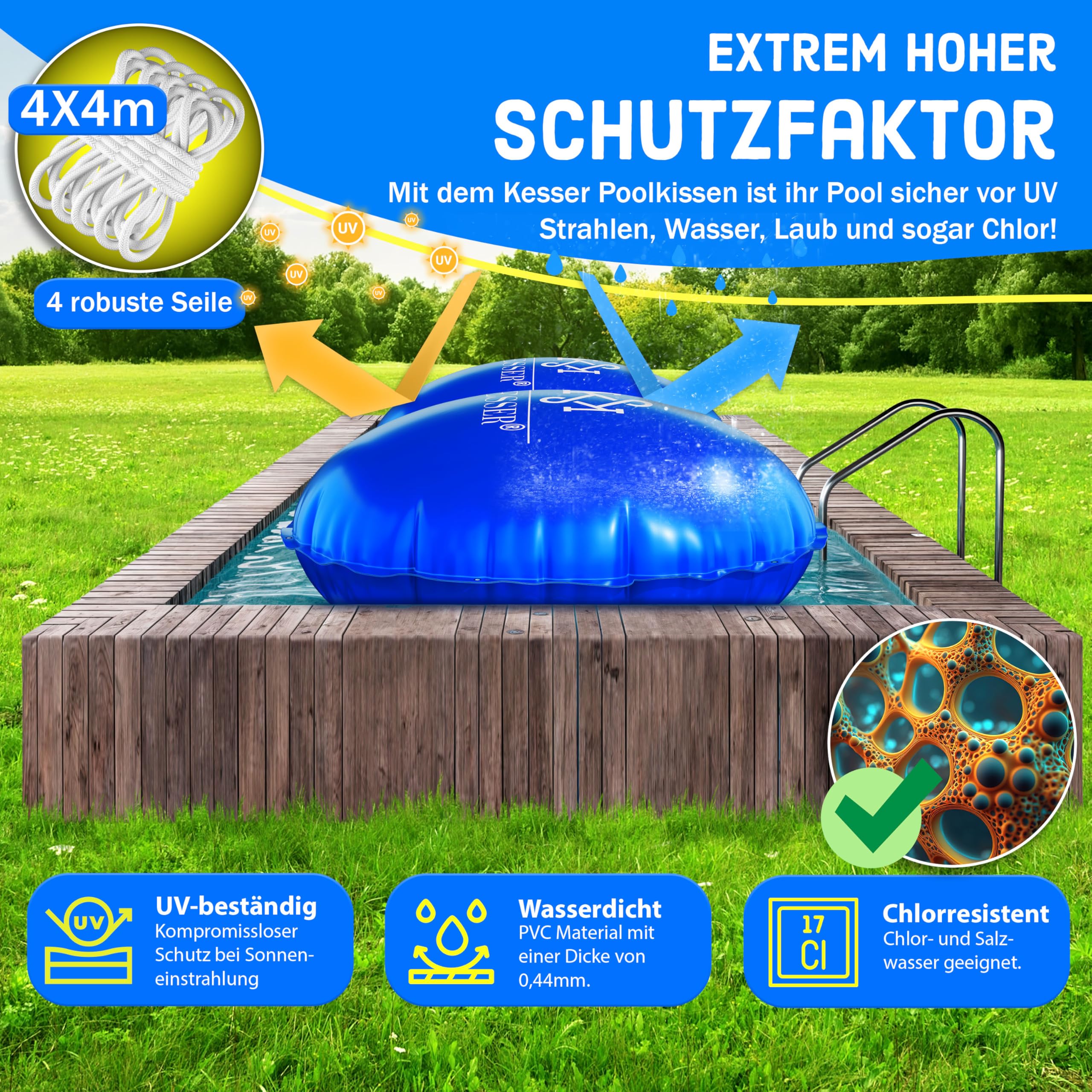 Essential für jeden Poolbesitzer - das Winter-Poolkissen in Rundform 120x120cm! Schützt deinen Pool zuverlässig vor Frostschäden und Eisdruck. Einfach aufblasen (ca. 70% Luft reicht), ins Wasser legen und mit dem 15m Seil fixieren - schon ist dein Pool winterfest. Aus 0,4mm starkem PVC mit Doppelnähten - mega reißfest und UV-beständig. Verhindert, dass sich Schnee und Laub unter der Abdeckung sammeln. Im Lieferumfang sind sogar Reparaturflicken dabei - falls mal was sein sollte. Im Frühjahr einfach entleeren, zusammenrollen und platzsparend verstauen. Mach deine Pool-Winterisierung damit zum Kinderspiel!