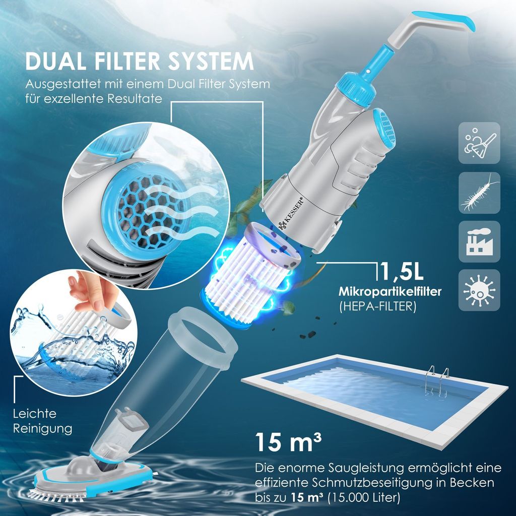 Das komplette Set enthält alles, was du brauchst: Saugdüse, Teleskopstange, Netzbeutel, Bürste und sogar Handschuhe. Der feine Netzbeutel fängt den ganzen Dreck auf, während das saubere Wasser zurück in den Pool fließt. Die Stangen lassen sich einfach zusammenschrauben und sind damit für jede Poolgröße geeignet.