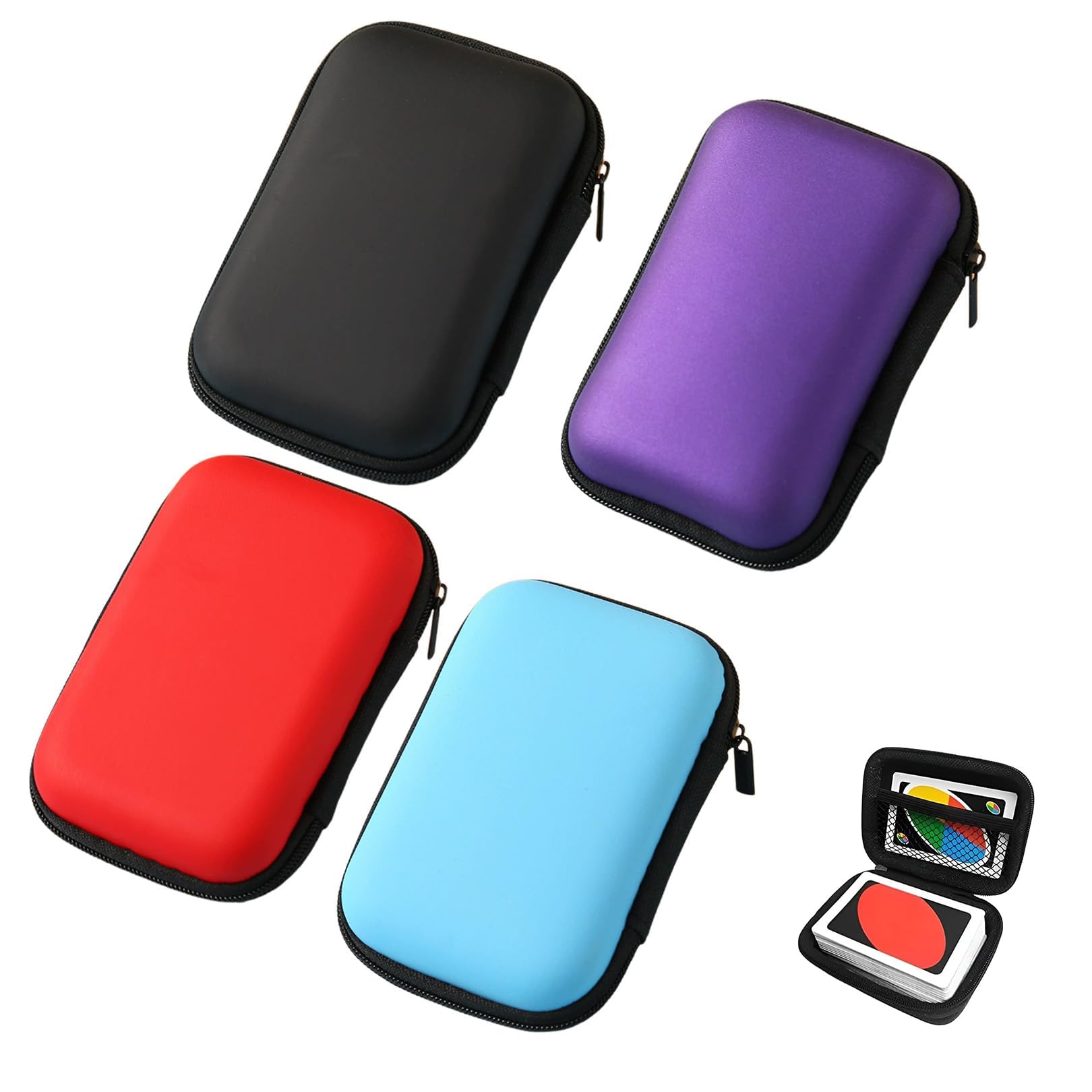 Schluss mit verlorenen oder beschädigten Spielkarten! Diese vier praktischen Kartenboxen in Schwarz, Silber, Blau und Rot halten deine UNO-, Skat- oder Poker-Karten sicher verwahrt. Aus robustem EVA-Material sind sie wasser- und staubabweisend - perfekt für unterwegs! Mit Reißverschluss und den Maßen 11x7,5x4 cm passen sie in jede Handtasche oder den Rucksack. Aber die Boxen können mehr: Sie eignen sich super für Kopfhörer, Ladekabel, USB-Sticks oder andere Kleinteile. Die verschiedenen Farben helfen dir, schnell zu finden was du suchst. Perfekt für Reisen, Camping oder einfach zu Hause. Nie wieder geknickte Karten oder verhedderte Kabel! Mit diesen Boxen hast du immer Ordnung in deinen Sachen. Und das Beste: Sie sind so stabil, dass sie auch mal was aushalten - ideal für Outdoor-Aktivitäten!