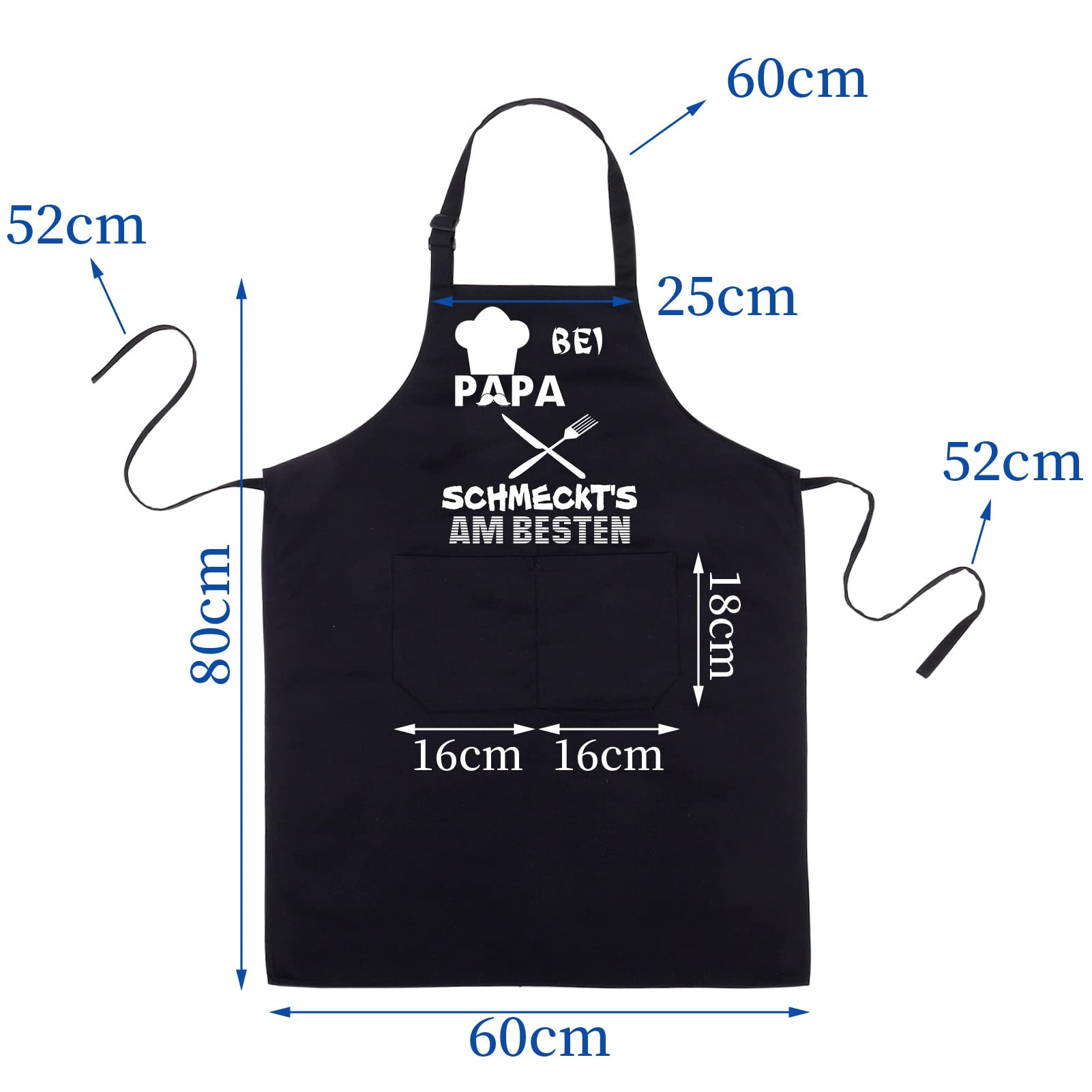 Die perfekte Schürze für alle Hobbyköche und Griller! Mit 64x73 cm Größe schützt sie zuverlässig von der Brust bis zu den Knien vor Öl-, Farb- und Wasserflecken. Der verstellbare Halsausschnitt (35-60 cm) passt sich jeder Körperform an. Die praktische Brusttasche bietet Platz für Handy, Werkzeuge oder Utensilien. Aus robustem Material in schwarz - ideal für Männer, die gerne kochen, grillen oder handwerken. Ein super Geschenk für Vatertag, Geburtstag, Weihnachten oder einfach so! Ob als Barista, Kellner oder Heimwerker - diese Schürze ist ein echter Allrounder. Mach deinem Papa eine Freude mit diesem praktischen und stylischen Küchenhelfer!