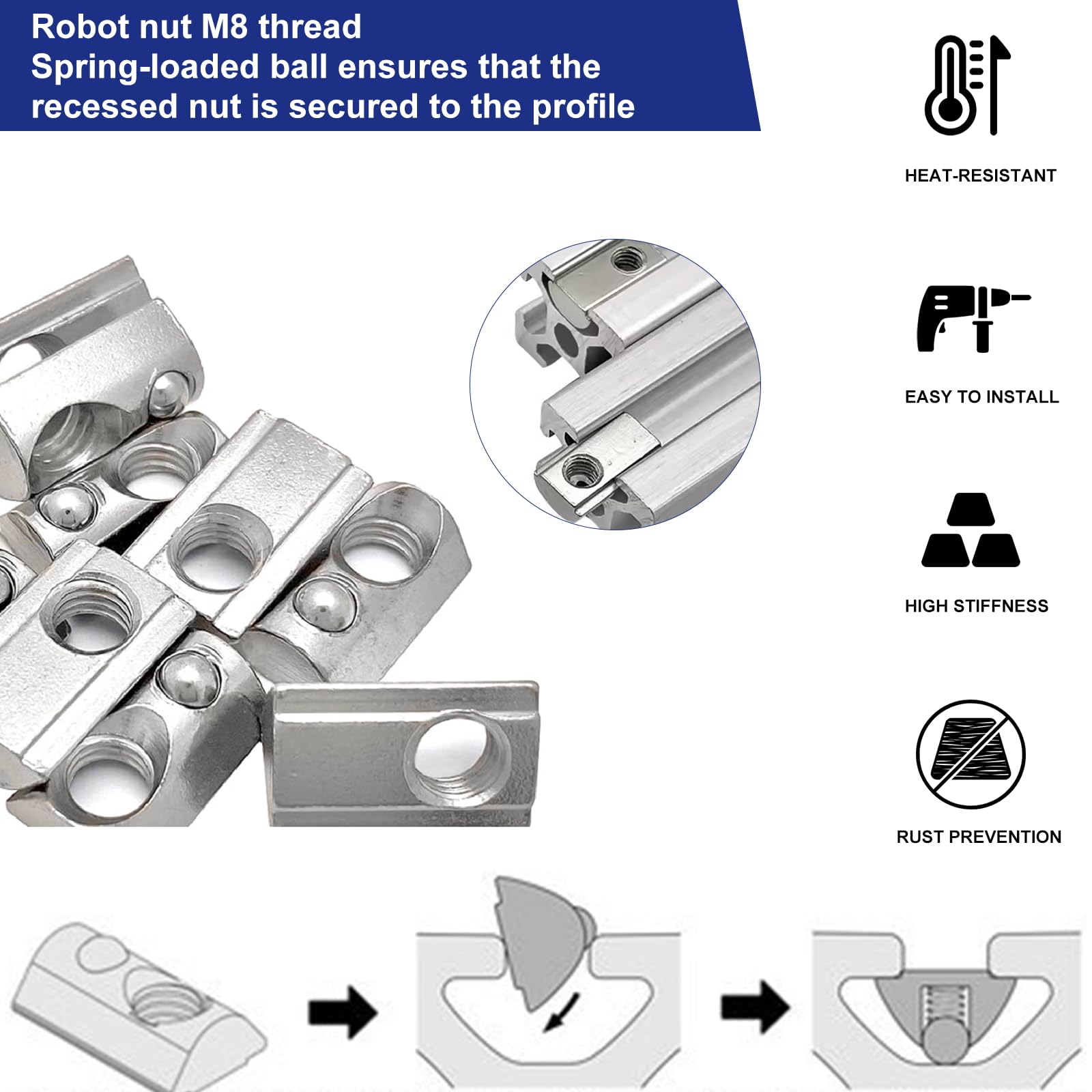 Perfekt für deine Bauprojekte! Unsere Nutensteine M8 sind die idealen Helfer für Alu-Profile im Bereich 40er Serie. Mit der praktischen Federkugel auf der Rückseite bleiben sie zuverlässig in der Nut positioniert - selbst bei senkrechter oder schräger Montage. Aus hochwertigem Kohlenstoffstahl gefertigt und vernickelt für beste Korrosionsbeständigkeit. Maße: 21x13x7,4 mm, passend für Profile mit 8-mm-Nut. Einfach einsetzen, die Kugel schnappt ein und schon ist die Mutter fixiert. Spart enorm Zeit beim Aufbau von Konstruktionen. Ideal für 3D-Drucker, CNC-Maschinen, Roboterbau, Solaranlagen und Automatisierungstechnik. In der Packung: 60 Stück dieser vielseitigen Gleitmuttern. Ob im Hobbybereich oder professionellen Einsatz - diese Qualitäts-Nutensteine machen jeden Aufbau einfacher und schneller. Die glatte Oberfläche ohne Grate garantiert problemlose Handhabung. Dein zuverlässiger Partner für stabile Verbindungen!