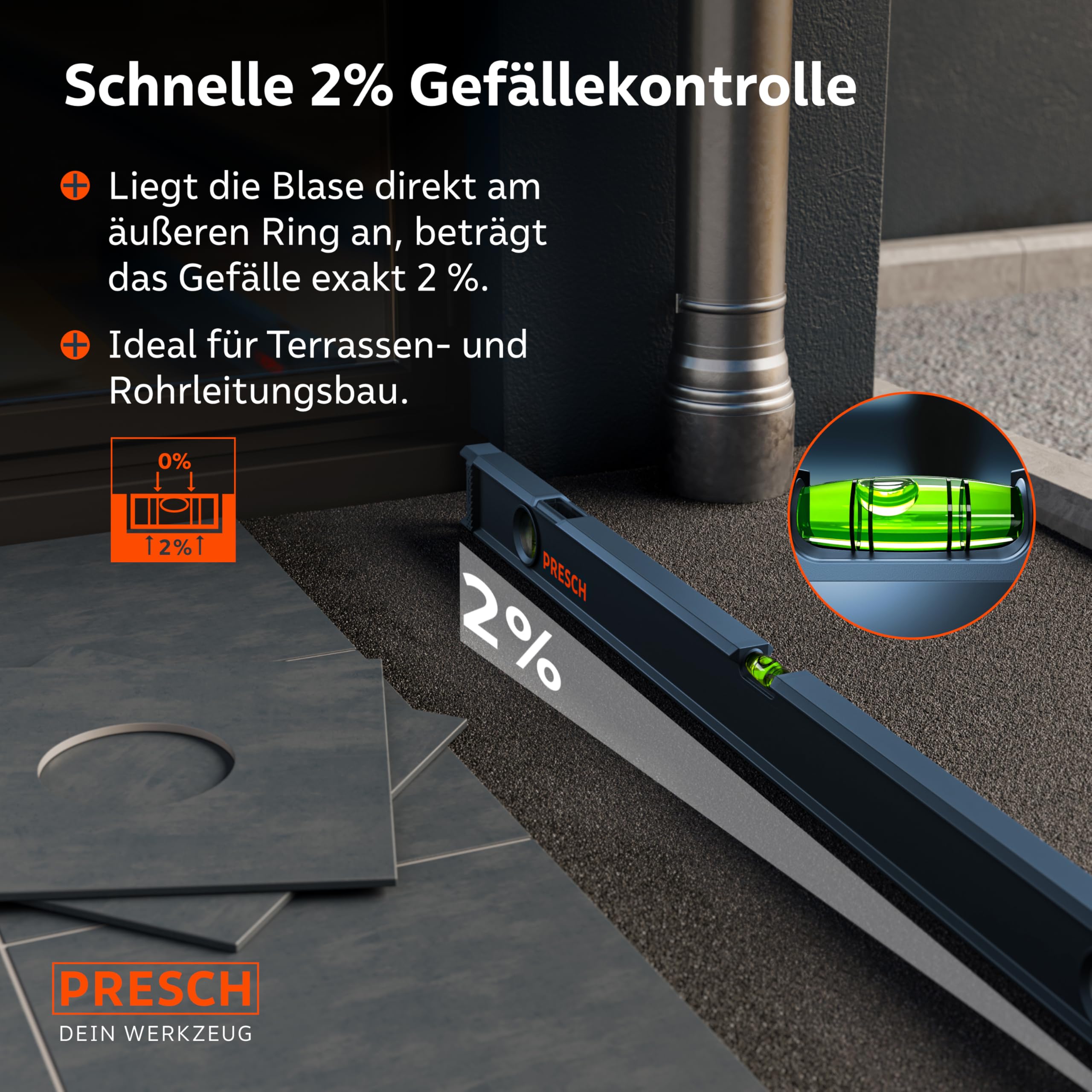 Das besondere: Die Vertical-View-Funktion - du kannst die Senkrechte von oben ablesen, ohne die Position zu wechseln. Und die 2%-Gefälle-Anzeige ist super praktisch für Pflasterarbeiten.