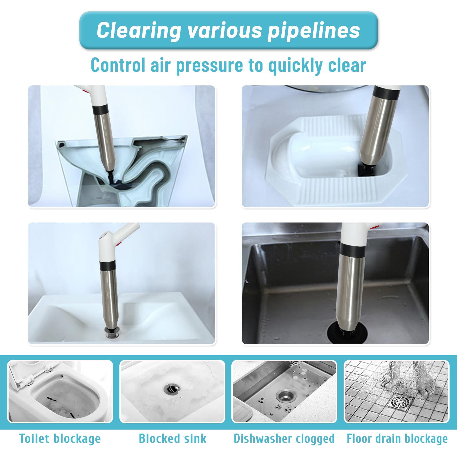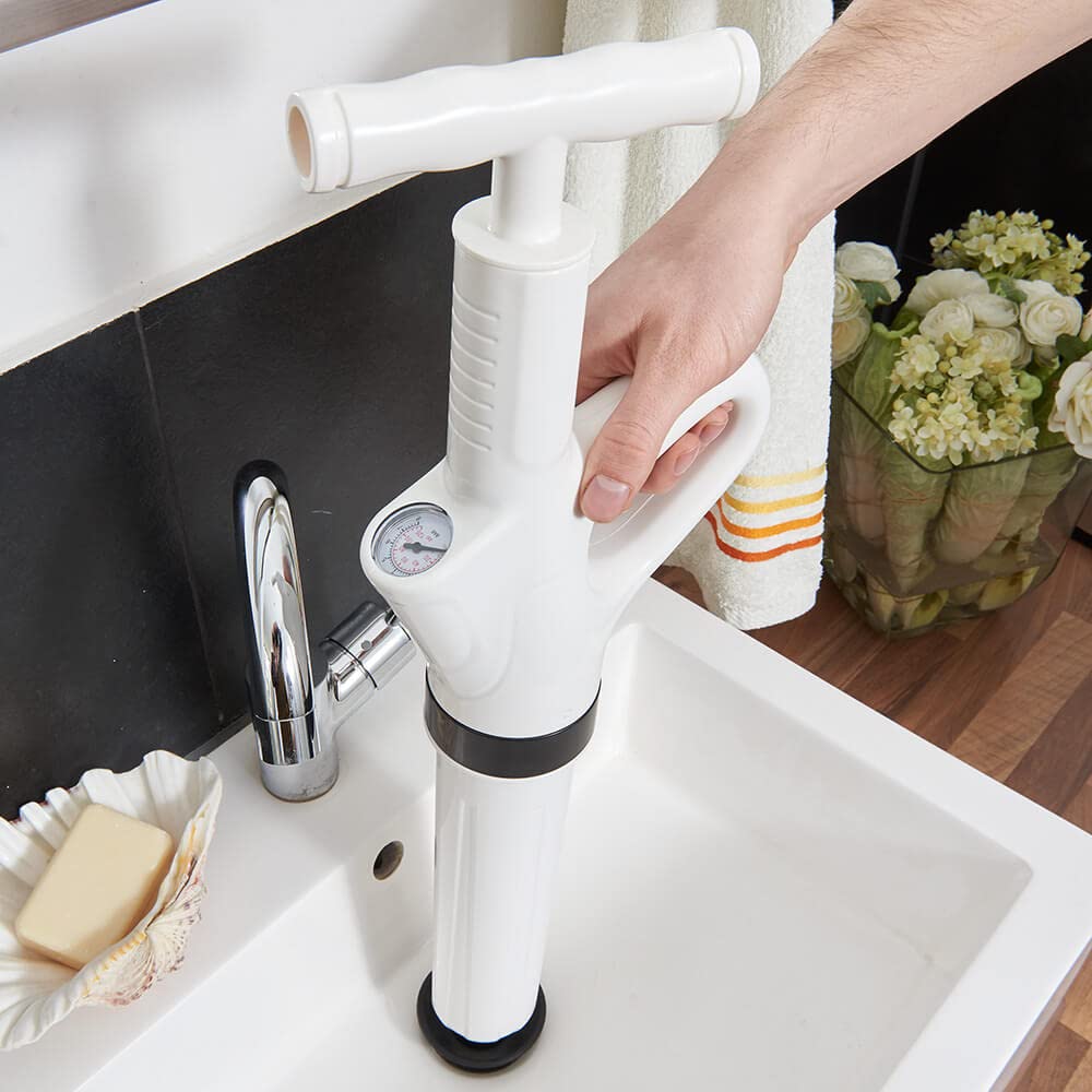 Verstopfte Abflüsse? Diese Pressluft-Rohrreinigungspumpe macht Schluss damit! Das 7-teilige Set inklusive 4 verschiedenen Köpfen für alle Verstopfungsarten. Mit Manometer für präzise Druckeinstellung von 0-8 Bar. Einfache Bedienung: Luftsack aufblasen, in den Abfluss einführen und Knopf drücken. Der Griff aus ABS, das Gehäuse aus Edelstahl - made to last. Perfekt für Toiletten, Waschbecken, Badewannen, Küchenspülen und Bodenabläufe. Beseitigt selbst hartnäckige Verstopfungen schnell und ohne Chemie. Ein Must-have für jeden Haushalt!