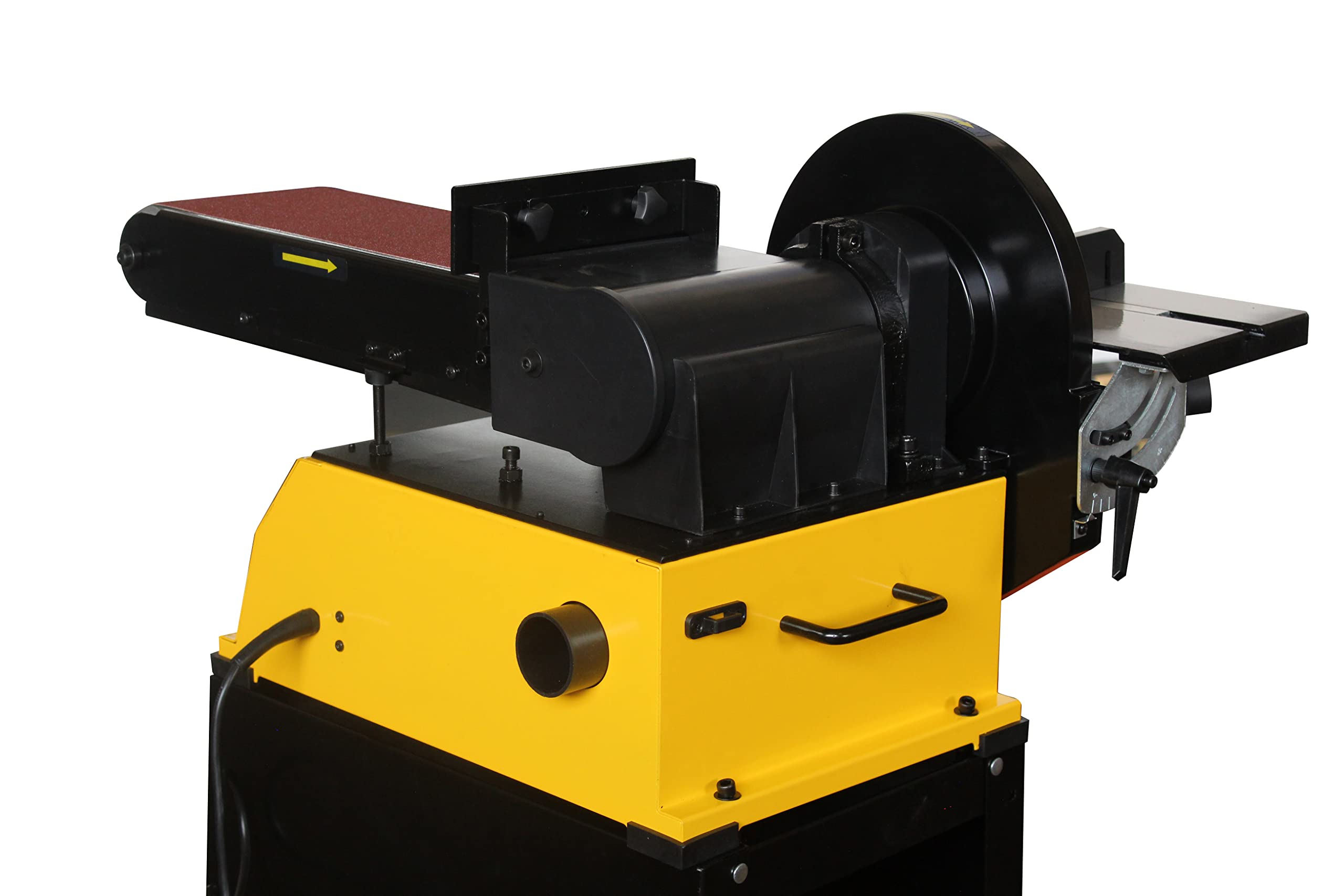 Schleifband (150x1220mm) schwenkbar von 0°-90°, Schleifteller (228mm Durchmesser) mit neigbarer Arbeitsplattform (0°-45°). Für präzise Rundungen, Fasen und Winkel.