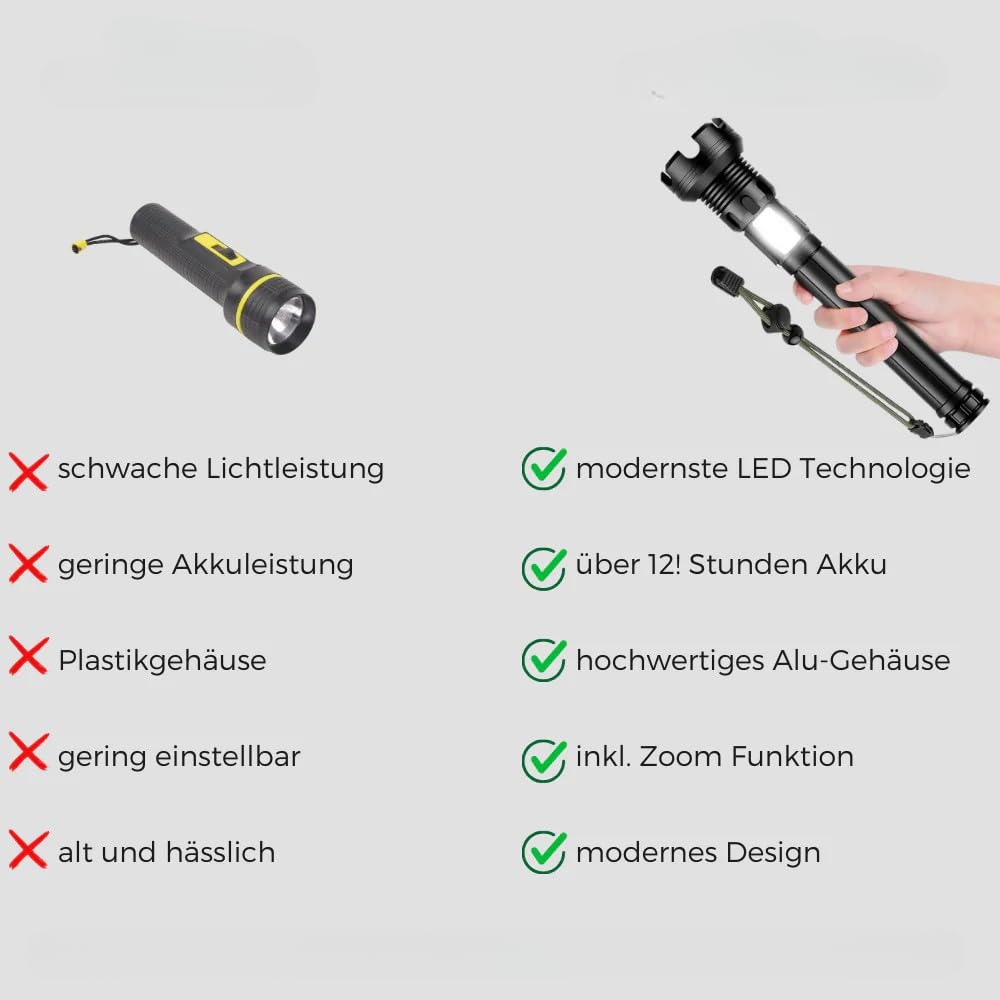 Boah, diese Taschenlampe ist einfach next level! 90.000 Lumen - damit machst du die Nacht zum Tag. Reichweite bis 500 Meter, das ist schon krass. Mit XHP90.2 LED-Technologie und 5 Modi: Stroboskop, SOS, niedrig, mittel, hoch. Zoom-Funktion nicht vergessen - mal Spot, mal Flutlicht. Aus Aluminium in Militärqualität, total robust und stoßfest. IP68 wasserdicht - hält sogar 2 Meter tief aus. Der Akku hält bis zu 12 Stunden, aufladen per USB-C. Rutschfestes Design, ergonomisch für Einhandbedienung. Ob Camping, Wandern oder Notfall - damit bist du immer safe. Design Award 2024 - sieht dazu noch mega cool aus!