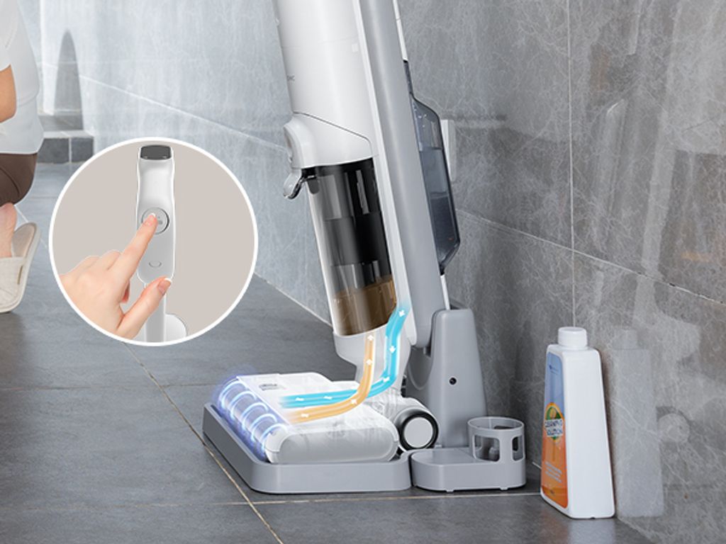 Das geniale Feature: Selbstreinigung auf Knopfdruck! Einfach die Taste drücken und die Walzenbürste sowie der Innenschlauch reinigen sich automatisch. Frisches Wasser für jeden Reinigungsgang durch separate Tanks (650ml Reinwasser, 500ml Schmutzwasser).