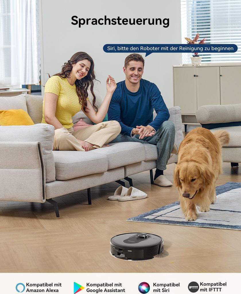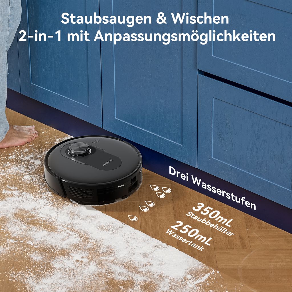 Der Proscenic Q8 Max+ erledigt das Putzen jetzt komplett alleine! Mit satten 8000Pa Saugkraft entfernt er selbst tiefsitzende Tierhaare und Krümel problemlos. Die integrierte Absaugstation mit 3L Staubbeutel sorgt für bis zu 60 Tage Wartungsfreiheit - einfach den vollen Beutel entsorgen und fertig! Der Roboter saugt, wischt und kehrt gleichzeitig, mit drei einstellbaren Wassermengen für verschiedene Bodenbeläge. Durch die präzise LiDAR-Navigation und nur 9,6 cm Höhe erreicht er selbst schwer zugängliche Stellen unter Möbeln. Besonders smart: Bis zu 5 Karten speichern, Reinigungsplanung per App, Sprachsteuerung via Alexa/Google Assistant und automatische Rückkehr zur Ladestation bei niedrigem Akku. Bei Teppichen erhöht sich die Saugkraft automatisch. Mit 200 Minuten Laufzeit schafft er auch große Wohnflächen. Endlich mehr Zeit für die schönen Dinge im Leben - überlass das Putzen dem Q8 Max+!