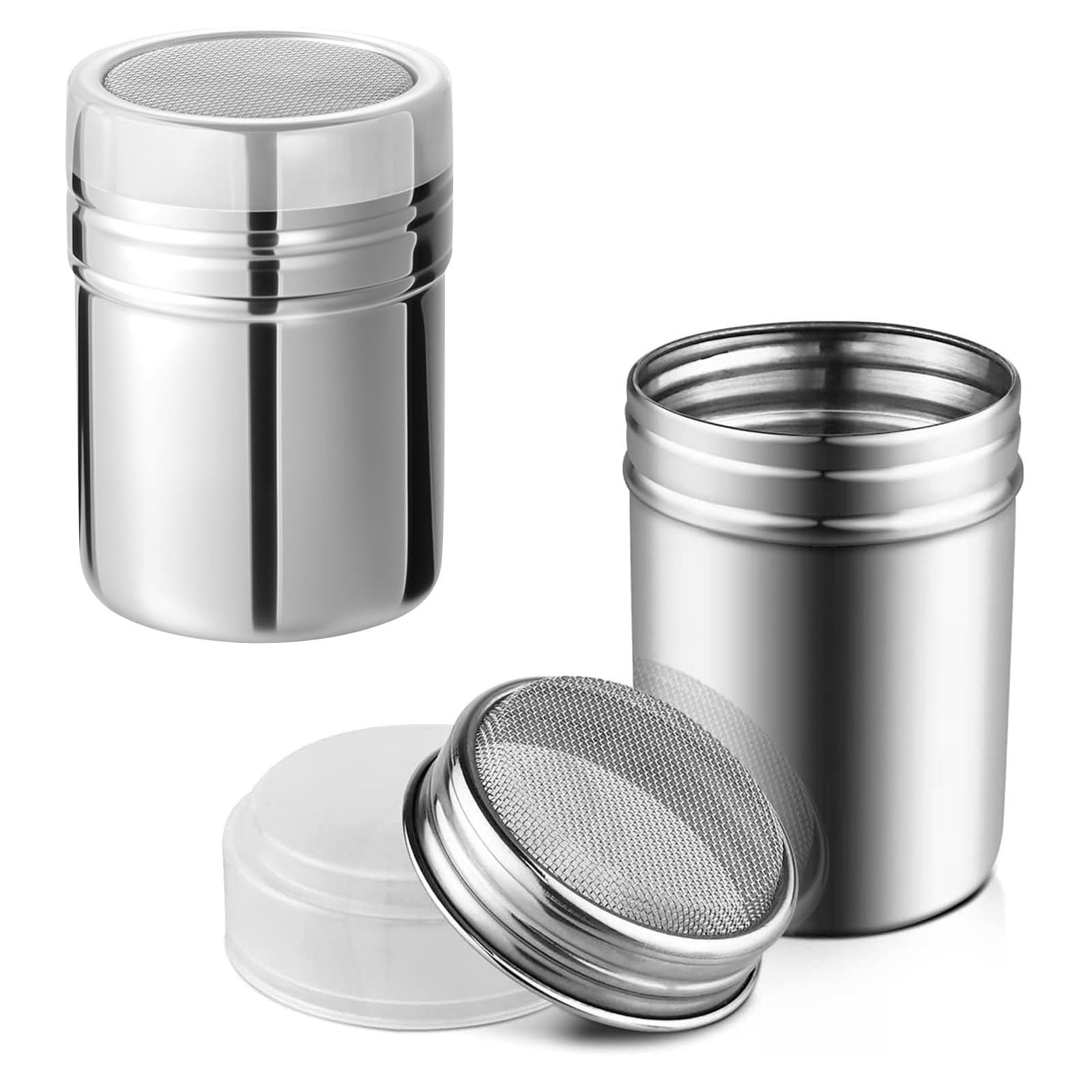Moin Bäcker und Kaffee-Liebhaber! Dieses 2er Set Edelstahl-Streuer ist der Hit für deine Küche. Aus lebensmittelechtem Edelstahl 304, super easy zu reinigen und spülmaschinengeeignet. Das feine 30-Mesh-Sieb sorgt für klumpenfreies Streuen von Puderzucker, Kakao, Zimt oder Mehl. Perfekt für Cappuccino-Schaum, Kuchen-Deko oder Desserts. Die gebürstete Innenwand verhindert Anhaftungen, der rutschfeste Boden schont deine Theke. Mit ergonomischem Gewinde zum einfachen Nachfüllen und sicheren Verschließen. Sieht nicht nur stylisch aus in Hochglanz-Silber, sondern ist auch mega praktisch. Nimm einen für Zucker, einen für Kakao - so hast du immer Ordnung. Ein Must-have für jede Küche!