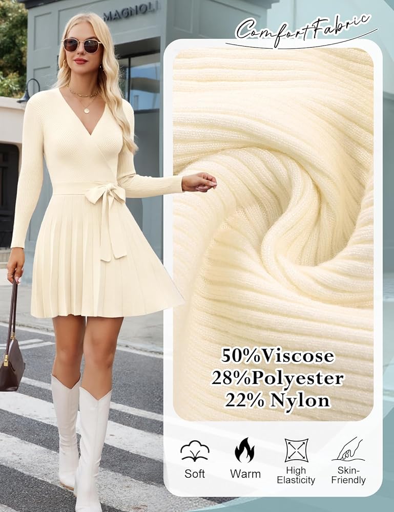Dieses Strickkleid ist dein neuer Liebling für Herbst und Winter! Aus weicher Viskose-Polyester-Nylon-Mischung (50%/28%/22%) fühlt es sich super kuschelig auf der Haut an. Der schmeichelhafte V-Ausschnitt betont dein Dekolleté, während der abnehmbare Gürtel deine Taille perfekt in Szene setzt. Die A-Linie passt zu jeder Figur und die langen Ärmel halten dich an kühleren Tagen warm. Ob im Büro, beim Date oder auf der Weihnachtsfeier - dieses Kleid macht immer eine gute Figur. Die Zopfstrick-Optik sieht hochwertig aus und die Falten im Rock verleihen Bewegung. Einfach zu pflegen: Handwäsche oder Maschinenwäsche im Wäschesack empfohlen. Ein zeitloses Stück, das du Jahre lang tragen wirst!