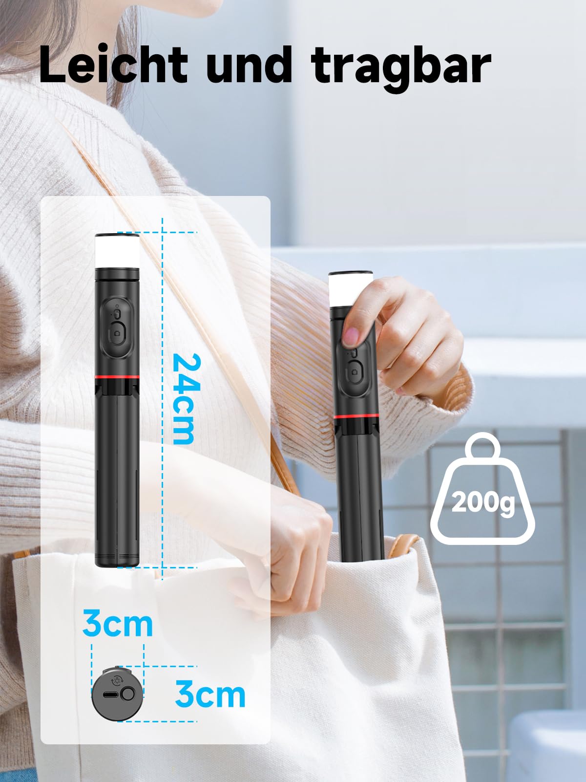 Moin, dieser Moman Selfie Stick ist dein neuer bester Freund für Fotos und Videos! Der Q12S kann alles: Selfie-Stick, Stativ und Desktop-Halter in einem. Mit eingebauter LED-Leuchte - 6 Modi mit weißem, weichem und warmem Licht, alle dimmbar. Aus Aluminium, aber trotzdem leicht (nur 200g), und klappt von 24cm auf 77cm auf. Die Silikonfüße sorgen für stabilen Stand, der Handyhalter dreht sich 360° und neigt 90°. Perfekt für Reisen, Vlogging, Videoanrufe oder Live-Streaming. Passt für Smartphones von 5,9-8cm Breite. Einfach zusammenklappen und in die Tasche stecken - damit machst du überall professionelle Aufnahmen, egal ob drinnen oder draußen!