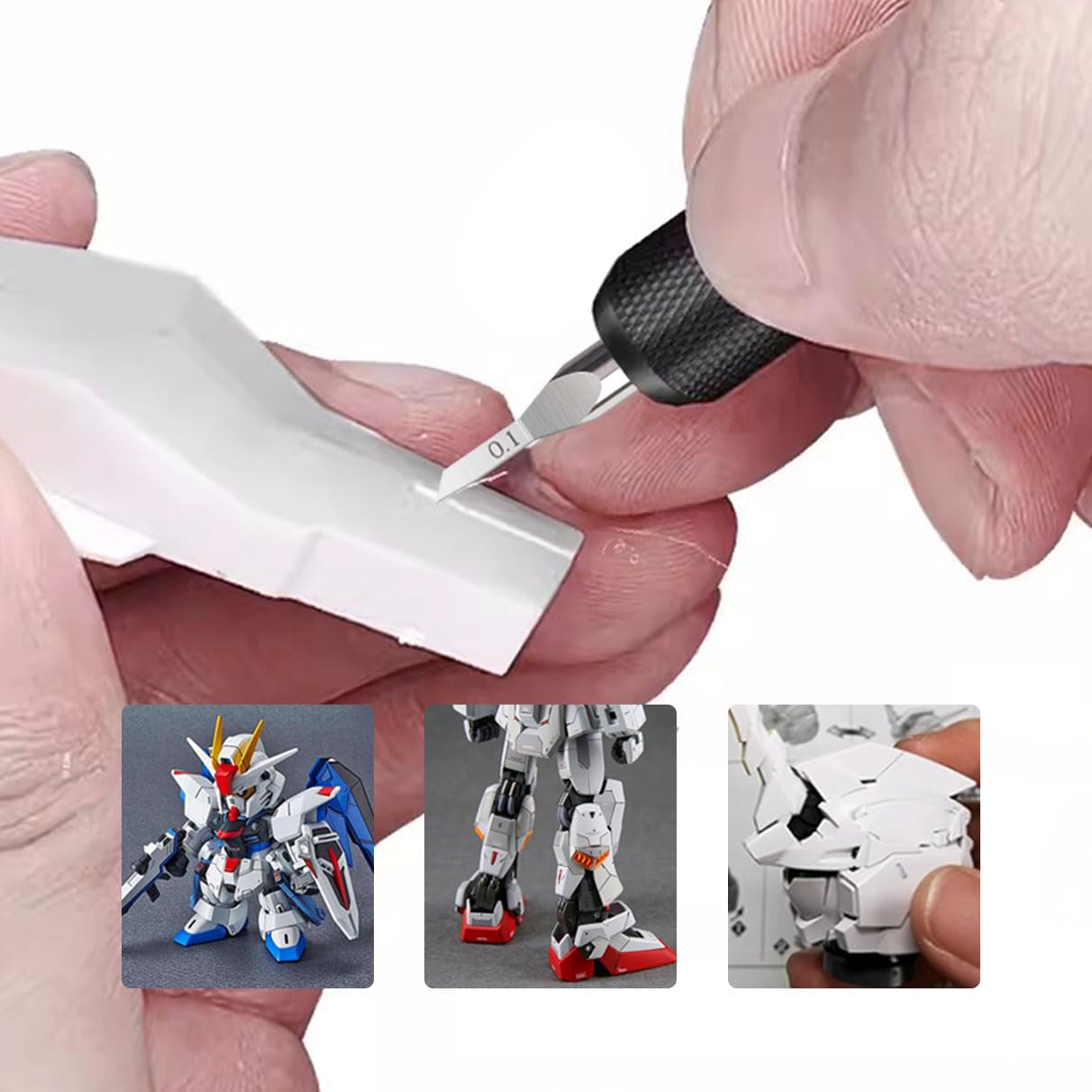 Hey Modellbau-Fans! Dieses Anreiß-Set von HARDWIN ist einfach der Hammer für eure Gunpla-Modelle. Im 9-teiligen Set sind drei ultra-scharfe Wolframkarbid-Klingen dabei: 0,15mm für feinste Details, 0,3mm Standard für Gundam und 0,5mm für breitere Linien. Der ergonomische Aluminium-Griff liegt super in der Hand - auch bei langen Sessions kein Problem. Mit zwei Griffen musst du nicht ständig die Bits wechseln. Inklusive Anreißband für saubere Linien und ner Schutzhülle. Perfekt für HG, RG, MG Modelle und Harz-Kits. Aber Achtung: Nur für Kunststoff/Harz, nicht für Metall! Die Teile sind mega scharf - also vorsichtig arbeiten und am besten Handschuhe tragen. Ein Traum für jeden Bastler!