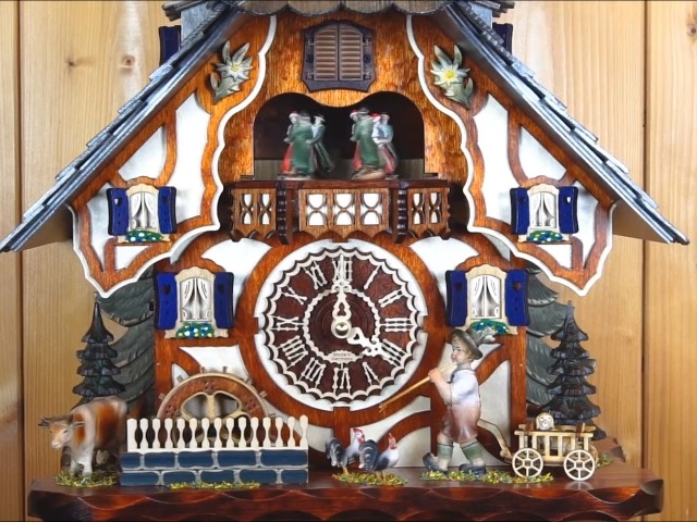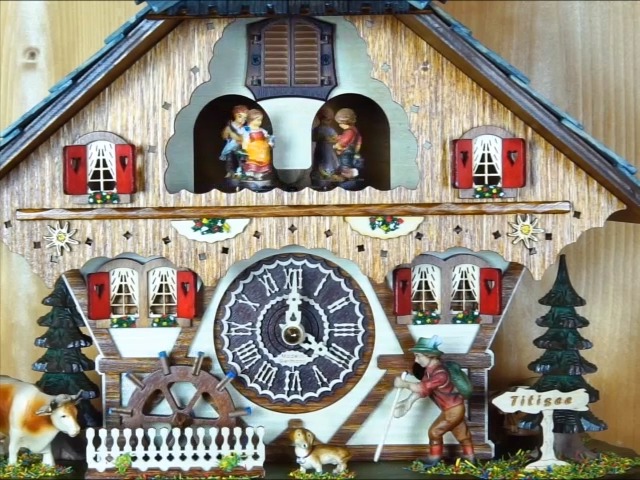 Das Quarzwerk spielt 12 verschiedene Melodien - von 'Edelweiss' über 'Für Elise' bis 'Sound of Silence'. Jede Stunde ruft der Kuckuck mit Echo. Praktisch: Automatische Nachtabschaltung für ungestörte Ruhe. Betrieben mit 3 Baby-C-Batterien (Laufzeit ca. 1 Jahr).