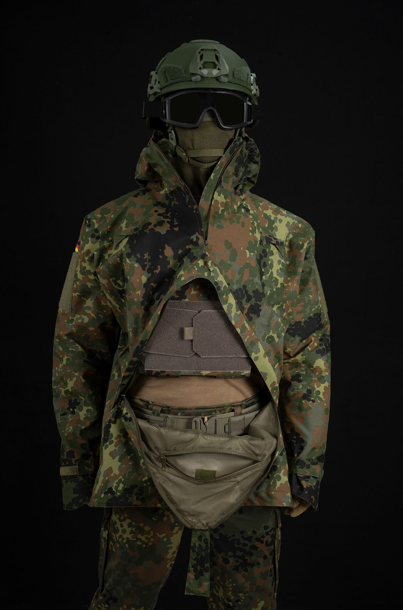 Professionelle Ausrüstung für anspruchsvolle Einsätze! Der RECON Bolero Spezialkräfte in original Flecktarn ist die perfekte Jacke für Outdoor-Aktivitäten, Militär-Enthusiasten und Survival-Fans. Mit der bewährten PTFE-Membran von Alpex bist du optimal vor Wind und Wetter geschützt. 🌧️\n\nDas Material entspricht der TL der Bundeswehr und verfügt über eine IRR-Beschichtung zur Reduzierung der IR-Signatur - also echte Profi-Qualität! Die zweieinhalblagige Konstruktion ist nicht nur wind- und wasserdicht, sondern bietet auch beste Atmungsaktivität für maximalen Komfort.\n\nPraktische Features gibt's reichlich: verstellbarer Kordelzug im Brustbereich, hochschließender wattierter Kragen, elastische Ärmelabschlüsse mit Daumenlöchern und Oberarm-Reißverschlüsse, die als Ventilation dienen oder Zugriff auf darunterliegende Taschen ermöglichen.\n\nDer spezielle Schnitt gibt dir vollen Zugriff auf deinen Plattenträger und mit den mitgelieferten Bungees inklusive Haken kannst du die Jacke daran befestigen. Große Klettflächen mit Leuchtstabgarage sorgen für einfache Freund-Feind-Kennung. Made in Europe - für höchste Qualitätsstandards. In Größen M, L, XL erhältlich, Gewicht ca. 420g (Größe L). Perfekt für taktische Einsätze, Outdoor-Abenteuer oder einfach nur für stylischen Camouflage-Look!
