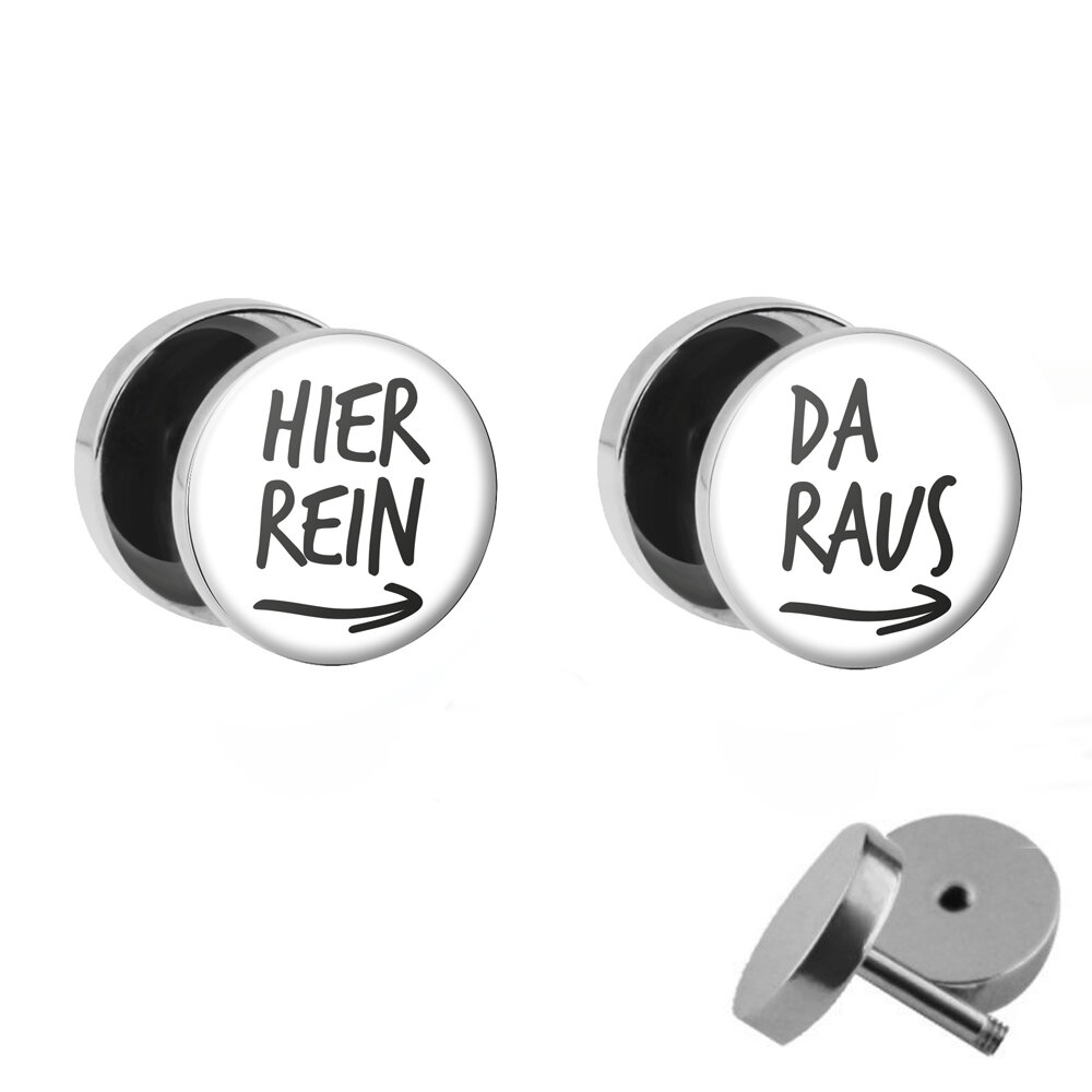 Diese Fake-Plugs sehen aus wie echte Tunnel, sind aber Ohrstecker zum einfachen Schrauben! Mit dem coolen Motiv 'Hier REIN' und 'DA Raus' in weiß-schwarz - total witzig und auffällig. Aus hochwertigem Chirurgenstahl 316L - nickelfrei und super verträglich, auch für empfindliche Ohren. Durchmesser 10mm, Stabdicke 1,2mm - gut sichtbar aber nicht übertrieben. Eine Platte lässt sich abschrauben - einfach ins Ohr einsetzen und wieder festschrauben. Perfekt für alle, die den Tunnel-Look mögen, aber keine gedehnten Ohrläppchen haben wollen. Super für Partys, Konzerte oder einfach als täglicher Hingucker. Einfach zu tragen und zu reinigen - keine komplizierte Pflege nötig. Im Set als Paar - für beide Ohren natürlich! Macht jedes Outfit sofort individueller und cooler. Einfach reinschrauben und bewundern lassen!