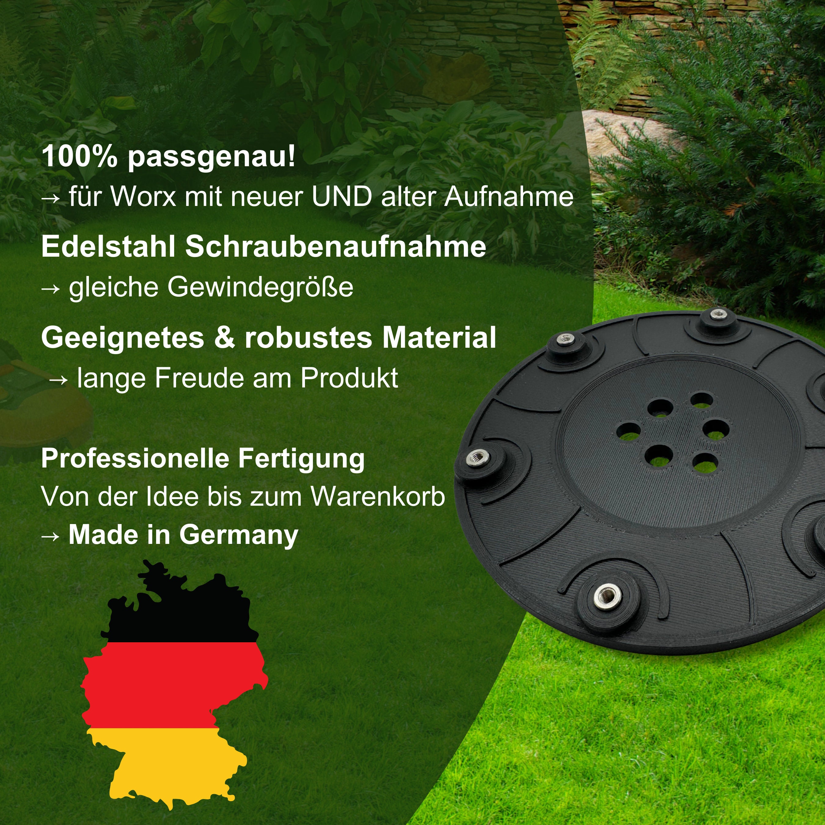 Hey Landroid-Besitzer! Dieser ROBO CLAWS Messerteller ist das perfekte Tuning für deinen Worx Mähroboter. Kompatibel mit L800 und L1000 Modellen ab Baujahr 2020 - aber Achtung: Nur für Geräte mit sechseckiger Halterung! Aus glasfaserverstärktem Polypropylen (PP-GFK) - ultra stabil aber leicht, belastet den Akku nicht. Im Set: 1 Messerteller, 6 scharfe Titan-Klingen mit Edelstahlschrauben und 3 Montageschrauben - also sofort einsatzbereit. Die integrierten Edelstahlgewinde sorgen für perfekten Halt - nichts locker oder wackelig. Damit wird dein Landroid deutlich leiser und schneidet das Gras viel präziser. Weniger Verschleiß, besseres Schnittbild - dein Rasen wird es dir danken! Einfache Montage - in wenigen Minuten getauscht. Perfekt als Ersatz für abgenutzte Originalteile oder einfach als Upgrade für noch bessere Mähleistung. Damit macht dein Mähroboter wieder Spaß und dein Rasen sieht aus wie vom Profi gepflegt. Ein absolutes Must-Have für jeden Landroid-Besitzer - probier's aus!
