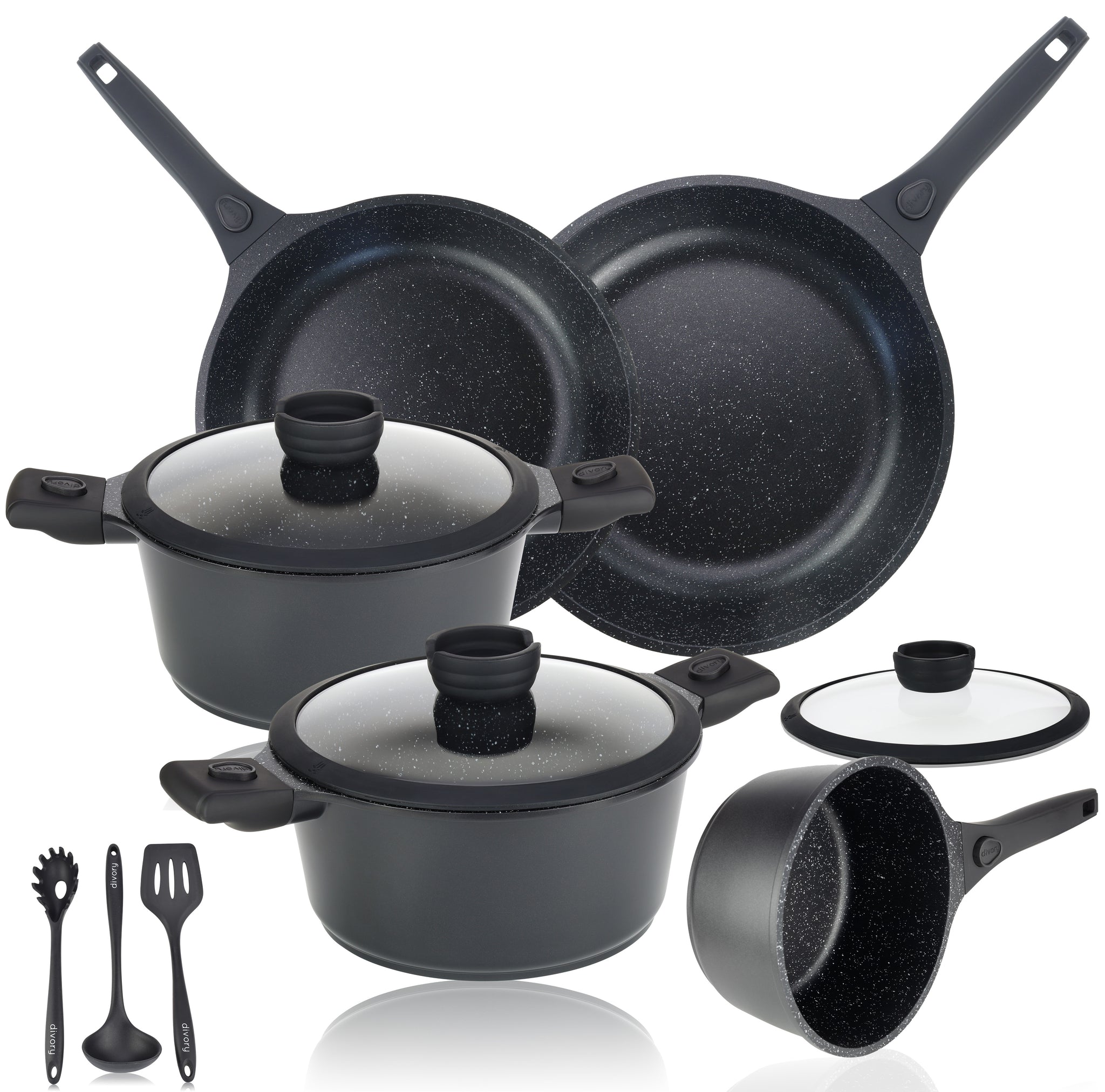 Dieses ROSSETTO Kochset hat alles, was eine moderne Küche braucht! 7 Teile inklusive: 2 Pfannen (20cm & 26cm), 2 Kasserollen (16cm & 20cm), 2 Deckel und ein abnehmbarer Griff. Die Pfannen haben eine super PFAS-freie Antihaftbeschichtung - gesund kochen war noch nie so einfach! Und weniger Öl benutzen ist auch kein Problem. Aus robustem Edelstahl gefertigt, der hitzebeständig ist und ewig hält. Passt auf ALLE Herdarten - auch Induktion! Und backofenfest bis 240°C ist das Set auch noch. Der geniale abnehmbare Griff macht's möglich: Vom Herd direkt auf den Tisch oder in den Kühlschrank, ohne umzufüllen. Und wenn's mal schnell gehen muss: Alles spülmaschinengeeignet! Durch das stapelbare Design sparst du 70% Platz in der Küche - perfekt auch für Camping oder kleine Küchen. Qualität, die sich lohnt - kochen war noch nie so praktisch!