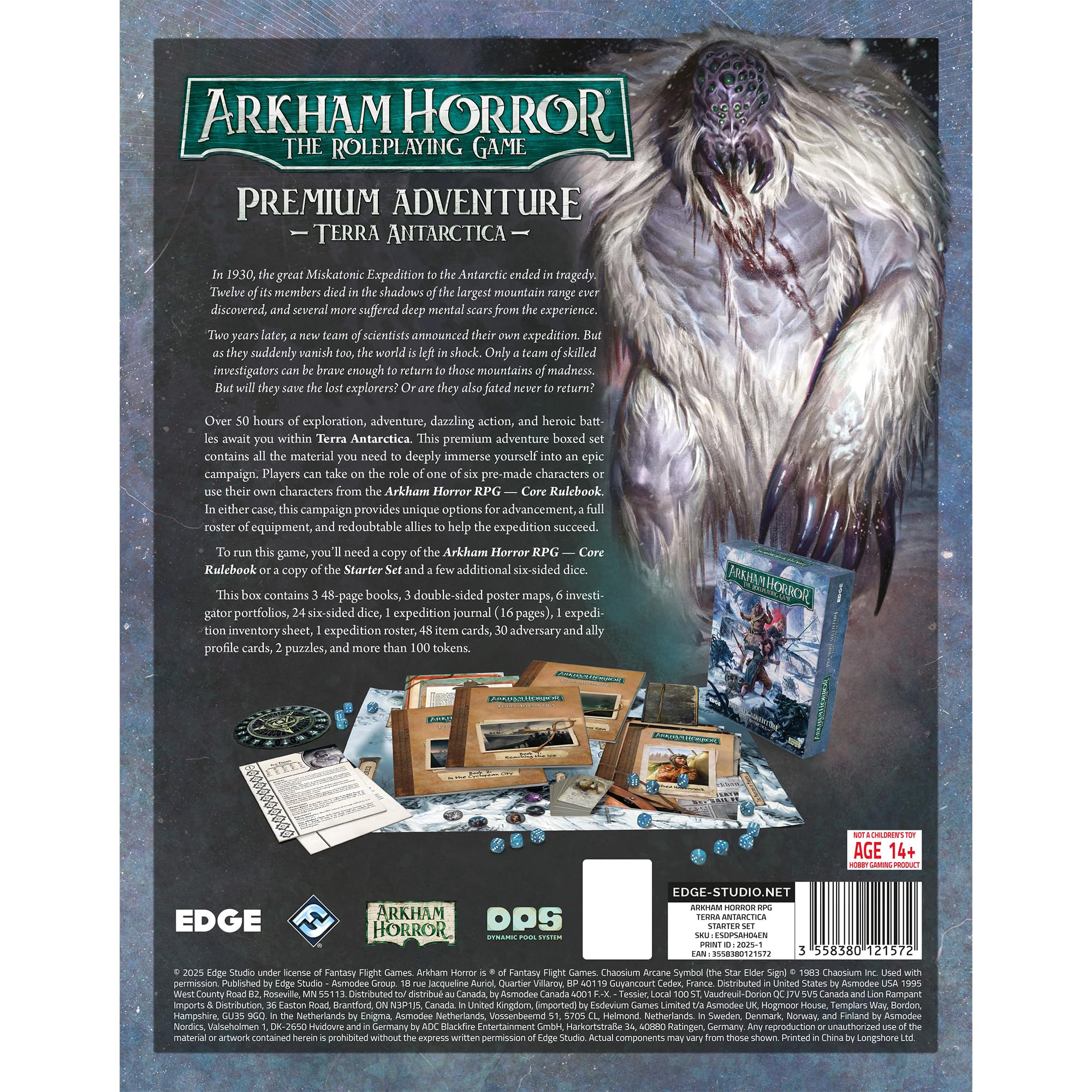 Tauche ein in eisigen Horror! Terra Antarctica ist eine epische Erweiterung für Arkham Horror Das Rollenspiel. Eine 50+ Stunden Kampagne führt dich in die trostlosen Weiten der Antarktis. Basierend auf H.P. Lovecrafts 'Berge des Wahnsinns'. Rette eine verlorene Expedition, bekämpfe Kultisten und enthülle uralte Geheimnisse. Für 2-6 Spieler ab 14 Jahren, Spieldauer ab 1 Stunde. Enthält neue Karten, NPC-Karten und Spielsteine. Psychologischer Horror vom Feinsten - perfekt für erfahrene Rollenspieler. Tiefgründige Story, fesselnde Charaktere und unvergessliche Momente. Erlebe kosmischen Horror in gefrorener Landschaft - gruselig gut!