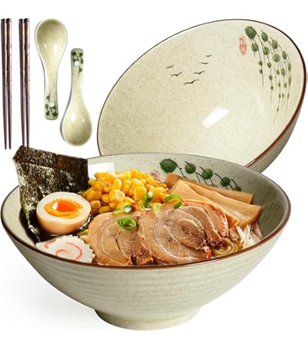 Mann, dieses Ramen-Schüssel Set ist ja richtig komplett! 2x 1200ml Keramikschüsseln (8 Zoll Durchmesser), dazu Löffel, Gabeln, Essstäbchen und sogar ein digitales Rezeptbuch mit Ramen-Rezepten. Die Schüsseln sind aus hochwertiger Keramik, spülmaschinenfest und mikrowellengeeignet. Der matte Rand gibt extra Grip und der verdickte Boden schützt den Tisch. Perfekt nicht nur für Ramen, sondern auch für Suppen, Salate oder Müsli. Alles schön verpackt in Geschenkverpackung - ideal für Kochbegeisterte oder als Einweihungsgeschenk. Damit wird jede Mahlzeit zum Restaurant-Erlebnis!