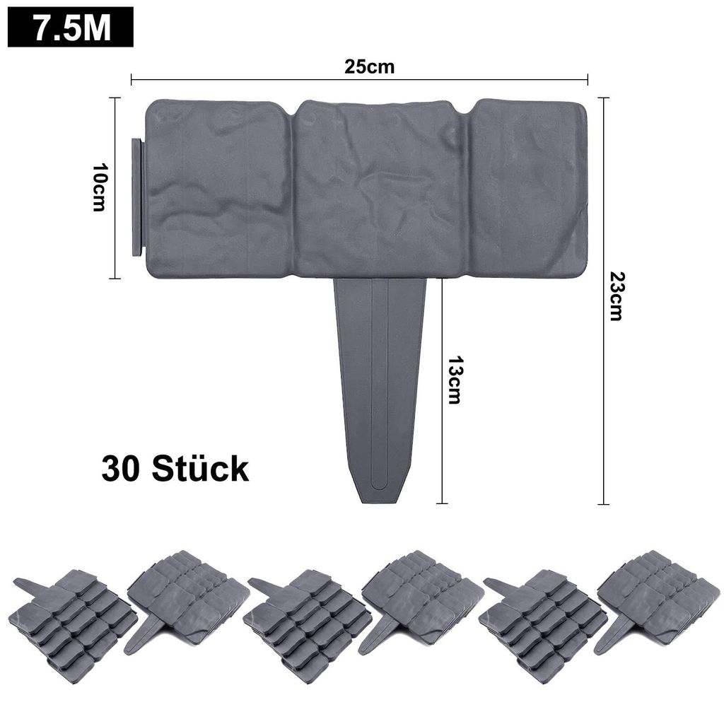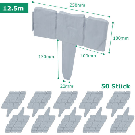 Hey Garten-Fans! Diese Rasenkanten sind echt ein Game-Changer für jeden der Ordnung in seinem Garten liebt. Die T-Form sieht nicht nur super aus wie echter Stein, sondern ist auch mega praktisch! Einfach in den Boden stecken und schon hast du saubere Grenzen zwischen Rasen und Beeten. 🌿\n\nWas im Paket alles dabei ist:\n• 50 Einzelelemente - insgesamt 12,5 Meter\n• Jedes Element 25x23cm - perfekte Größe\n• T-Form Design - stabil und optisch top\n• Mit integrierten Bodenspießen - hält bombenfest\n• Verbindungsschnallen - einfach zusammenstecken\n\nMaterial und Qualität:\n• Aus robustem PP-Kunststoff - hält ewig\n• Steinoptik - sieht aus wie echter Naturstein\n• Wetterfest - von Frühling bis Winter\n• Rostfrei - kein Ärger mit Korrosion\n• UV-beständig - verblasst nicht\n\nWarum das System so clever ist:\n• Flexibel - lässt sich um Kurven biegen\n• Schneidbar - mit Säge anpassbar\n• Wiederverwendbar - einfach umsetzen\n• Pflegeleicht - einfach abspülen\n• Ohne Werkzeug - nur Hände needed\n\nSo einfach geht's:\n1. Boden lockern und vorbereiten\n2. Erste Kante positionieren\n3. Nächstes Element einrasten\n4. Mit Fuß in Boden drücken\n5. Fertig!\n\nEcht praktisch für:\n• Beeteinfassungen\n• Rasenbegrenzungen\n• Wegabtrennungen\n• Spielplatz-Begrenzungen\n• Pool-Umrandungen\n\nDie Optik ist einfach klasse - sieht aus wie teurer Naturstein, kostet aber nur einen Bruchteil. Und im Gegensatz zu Stein kannst du die Teile einfach wieder ausbuddeln wenn du was umgestalten willst.\n\nTipp: Boden vorher gut wässern - dann gehen die Spieße noch leichter rein! Und nicht mit Hammer draufhauen - sonst brechen die Spieße vielleicht.\n\nDein Garten wird so viel ordentlicher aussehen und das Rasenmähen wird zum Kinderspiel! Echt empfehlenswert für alle die ihren Garten lieben.