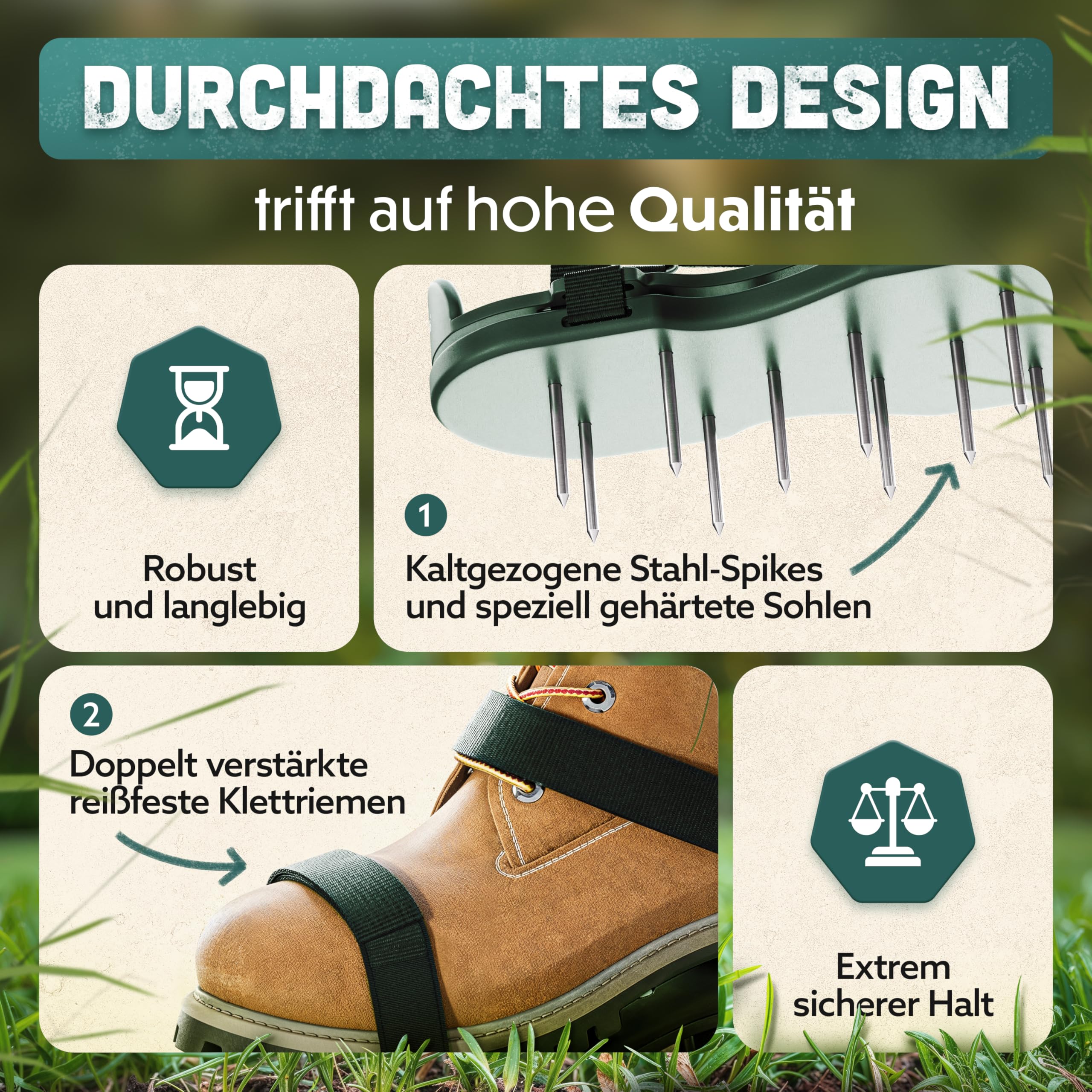 Das geniale Dualsohlen-System verhindert, dass Erde an den Stacheln haften bleibt. Perfekt für Garten, Sportplätze und Baustellen. Dein Rasen wird es dir danken!