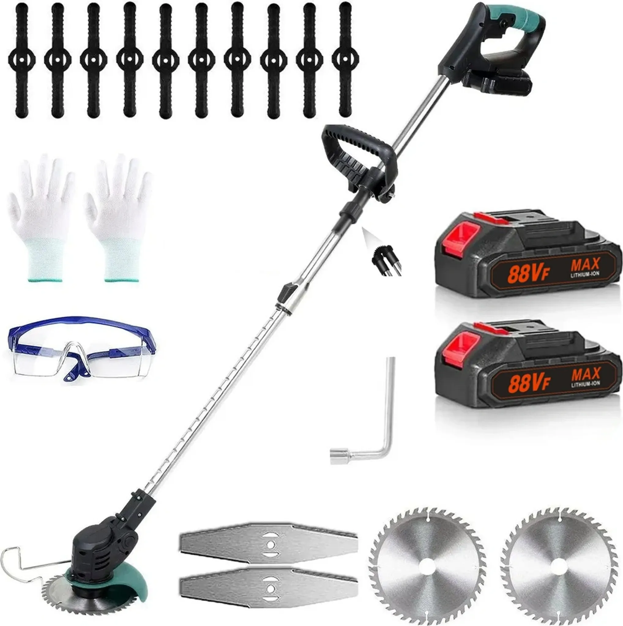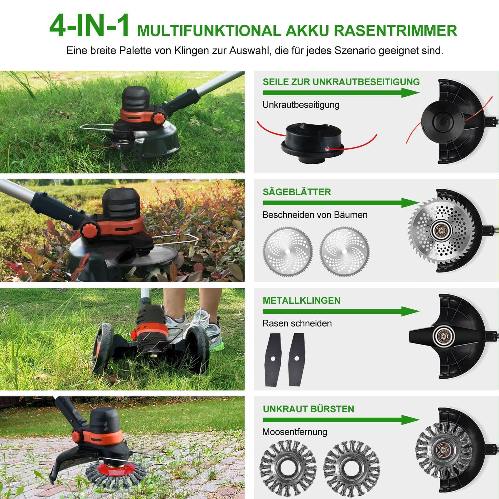 Dieser Alleskönner macht deine Gartenarbeit zum Kinderspiel! Der 800W starke Akku-Rasentrimmer kommt mit 5 verschiedenen Funktionen: Als Rasentrimmer, mit drei verschiedenen Schneidsystemen (Drahtseil, Edelstahlmesser, Manganstahl-Rundmesser) und einer Unkrautbürste. Der kraftvolle Kupfermotor bringt es auf 8000 U/min - damit schneidest du selbst hartnäckiges Gestrüpp und dicke Äste mühelos durch. Im Lieferumfang sind 2x 3,0Ah Akkus mit LCD-Anzeige enthalten, die jeweils bis zu 60 Minuten Laufzeit bieten. Das 90°-schwenkbare Schneidsystem mit praktischem Stützrad ermöglicht präzise Kantenschnitte und einfaches Arbeiten an Hängen. Mit nur 2,1kg Gewicht und ergonomischem Anti-Rutsch-Griff liegt der Trimmer perfekt in der Hand. Inklusive Schutzbrille und Handschuhen für sichere Arbeit. Kompatibel mit Makita-Akkusystem. Ob für den Hof, die Gartengestaltung oder unwegsames Gelände - mit diesem Profi-Gerät meisterst du jede Herausforderung!