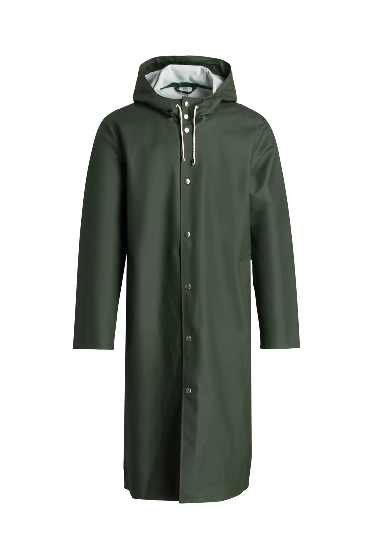 Schwedisches Design meets absolute Wasserdichtigkeit! Der STUTTERHEIM Stockholm Regenmantel ist ein echter Klassiker. Handgefertigt aus robuster, gummierten Baumwolle - zu 100% wasserdicht, garantiert! Die doppelt verschweißten Nähte lassen keinen Tropfen durch. Die normale, gerade Passform sitzt lässig über der Kleidung. Mit metallischen Druckknöpfen, Belüftungsöffnungen und verstellbarem Kordelzug an der Kapuze. Das Pastellgrün sieht einfach mega stylisch aus. Achtung bei der Größe: Der Mantel fällt großzügig aus. Wenn ihr zwischen zwei Größen schwankt, nehmt lieber die kleinere. Frauen sollten eine Größe kleiner als normal wählen. Ob Stadtbummel bei Regen oder Wanderung im Niesel - mit diesem Mantel bleibt ihr garantiert trocken. Ein Investment für Jahre, das nicht nur praktisch ist, sondern auch richtig gut aussieht. Schwedische Qualität die überzeugt!