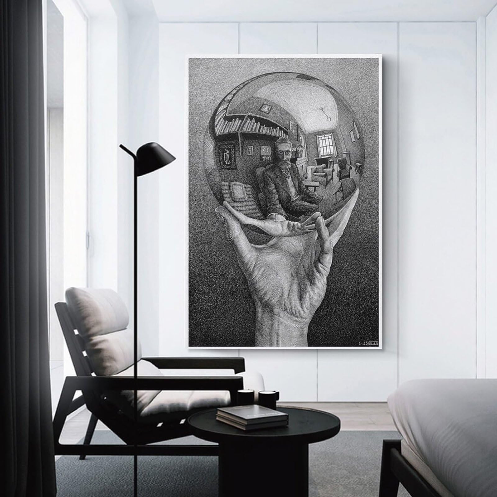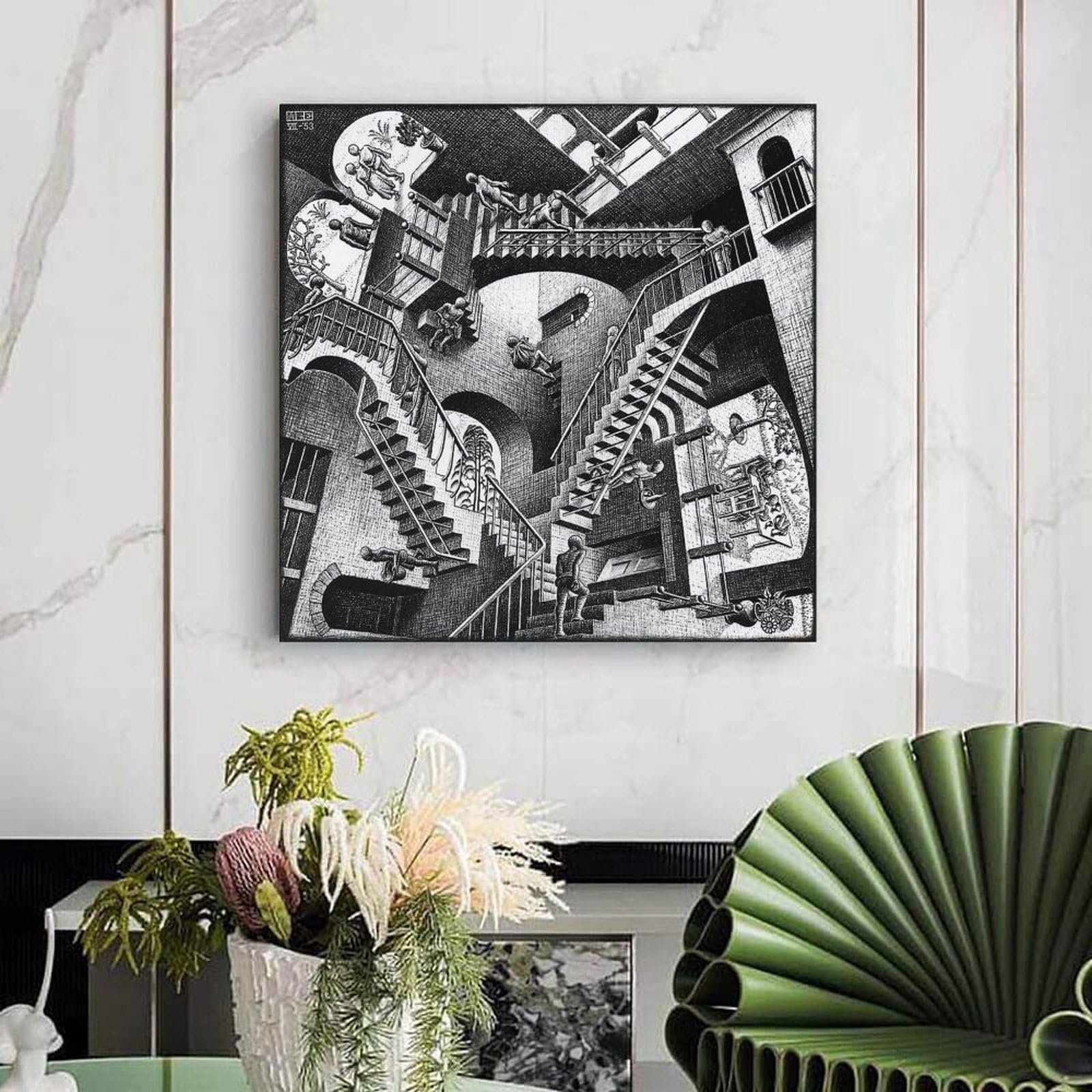 Kunst für deine Wände! Dieser hochwertige Leinwanddruck zeigt M.C. Eschers berühmtes Werk 'Relativität' in bester Qualität. Format 50x50cm - perfekt für Wohnzimmer, Schlafzimmer oder Büro. Professionell gedruckt mit scharfen Details und lebendigen Farben. Jedes Bild wird liebevoll von Hand gerahmt. Verwandele deine vier Wände in eine Galerie und genieße täglich dieses faszinierende Kunstwerk. Ein echter Hingucker für alle Kunstliebhaber und die, die es noch werden wollen!