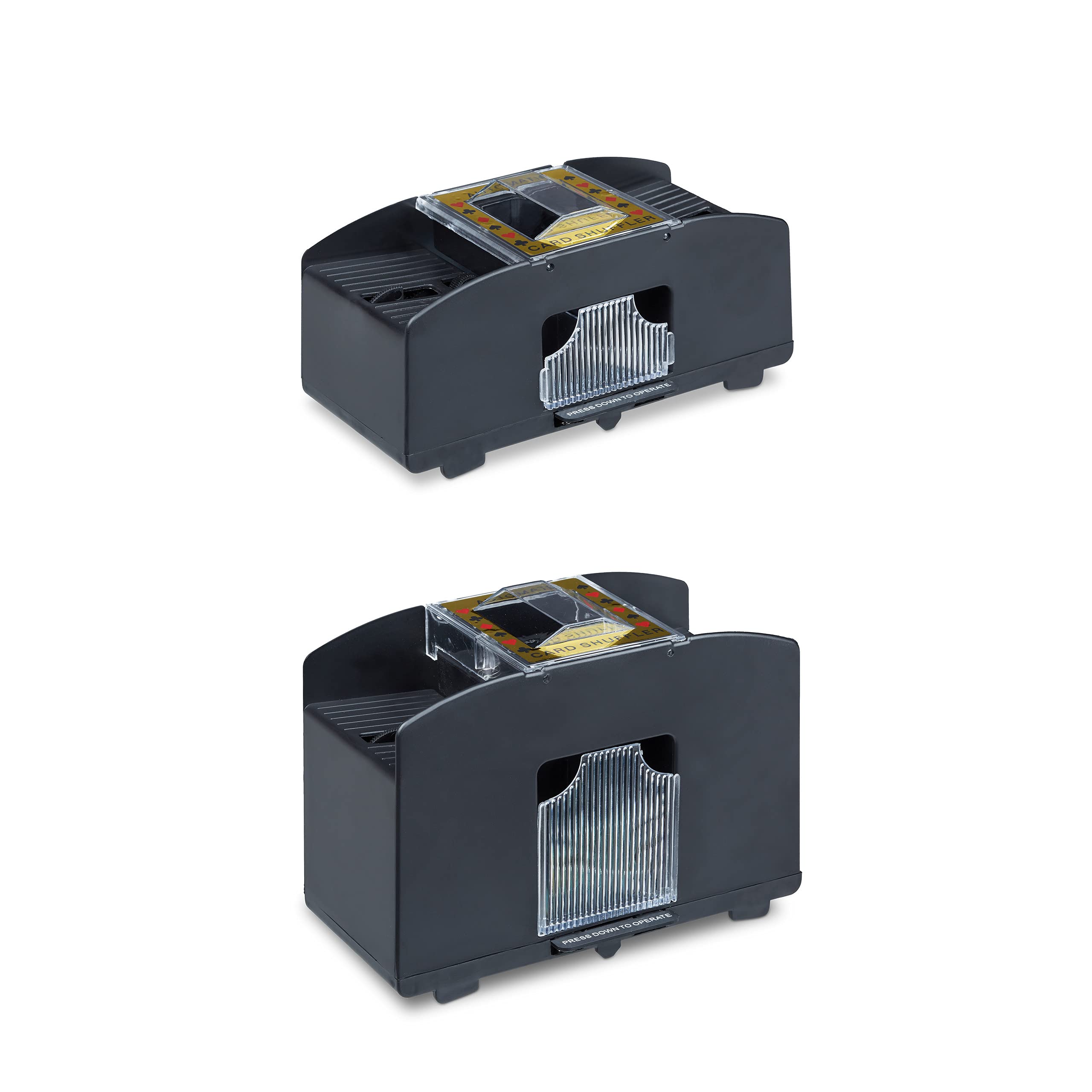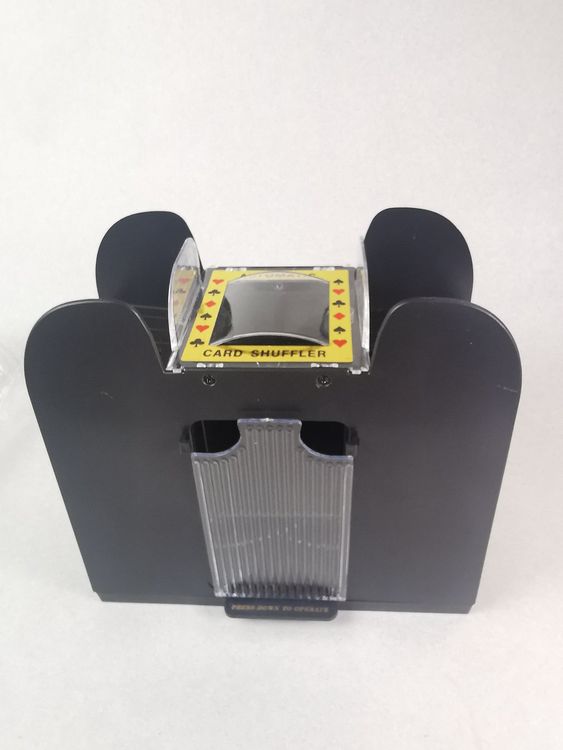 Schluss mit Diskussionen über unfaire Kartenverteilung! Dieser automatische Kartenmischer von Relaxdays macht jeden Spieleabend fair und unterhaltsam. In ansprechender Holzoptik mischt er bis zu 2 Decks Spielkarten perfekt durch. Einfach die Karten in die beiden Einlegefächer stecken, Knopf drücken und schon werden sie gründlich gemischt und im Ausgabefach bereitgelegt. Perfekt für Poker, Rommé, Skat und viele andere Kartenspiele. Mit den Maßen 10x24x13,5cm ist er kompakt genug für jeden Spieltisch. Benötigt 4 AA-Batterien (nicht im Lieferumfang). Für Standard-Kartengrößen bis 8,8x6,3cm geeignet. Aus robustem Kunststoff gefertigt - made in Germany mit europäischen Qualitätsstandards. Beendet Streitigkeiten über das Mischen und beschleunigt das Spiel - mehr Zeit für den eigentlichen Spielspaß! Ein Muss für jede Spiele-Sammlung - bestelle jetzt und mache deine Spieleabende noch unterhaltsamer!