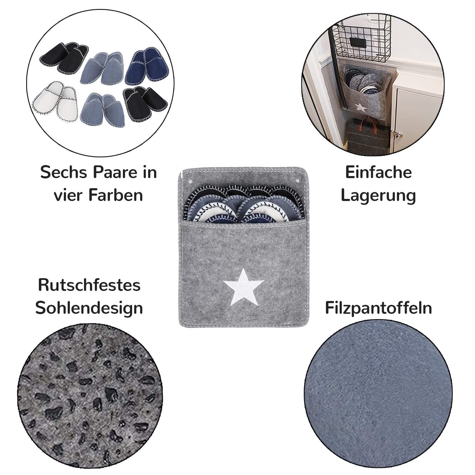 Boah, dieses Hausschuh-Set von Relaxdays ist perfekt für alle, die oft Besuch bekommen! 6 Paar gemütliche Filzpantoffeln in 3 verschiedenen Größen - 2x 36/39, 2x 40/42, 2x 43/45. Also für wirklich alle Größen was dabei. Mit Antirutsch-Sohle für sicheren Halt, selbst auf glatten Böden. In verschiedenen Farben - Grau, Dunkelblau, Schwarz, Weiß - sieht total stylisch aus. Kommt in ner praktischen Aufbewahrungstasche mit 'Home'-Stickerei, also immer griffbereit wenn's klingelt. Super für Zuhause, aber auch für Hotels oder Museen. Deutsche Markenqualität mit über 10 Jahren Erfahrung. Macht deine Gäste gleich willkommener und deine Böden bleiben sauber. Auch ein super Geschenk zum Einzug! Einfach auspacken und deine Gäste werden begeistert sein.