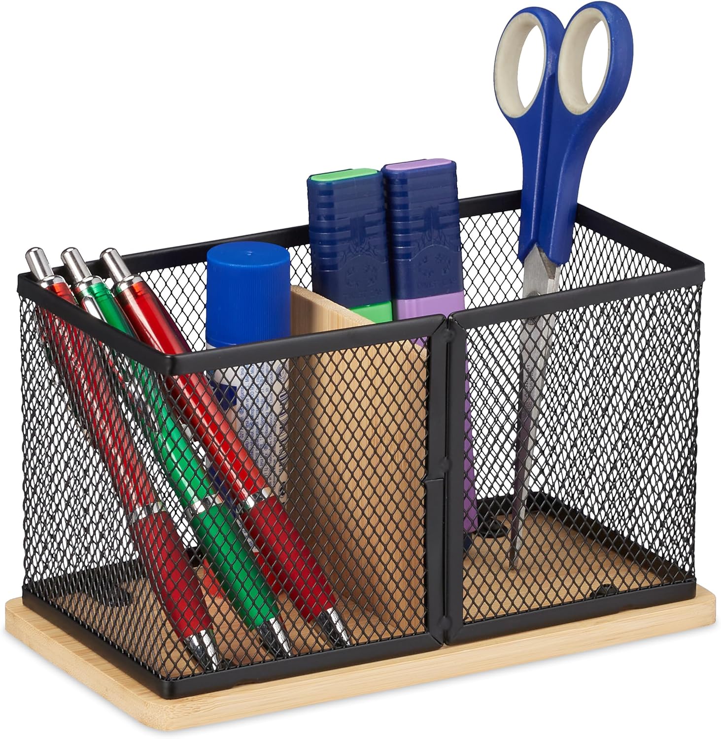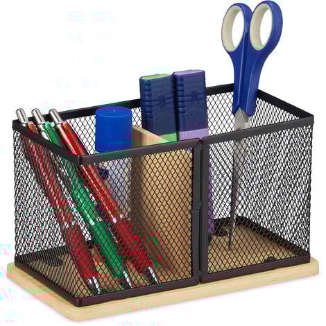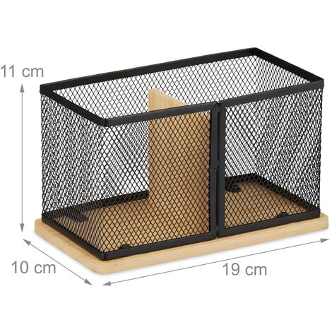 Ordnung muss sein! Dieser stylische Stiftehalter aus Bambus bringt Struktur auf deinen Schreibtisch. Mit zwei praktischen Fächern hast du Stifte, Marker und andere Utensilien immer griffbereit. Das natürliche Bambus-Design in Kombination mit dem weißen Metallgeflecht sieht modern und zugleich warm aus. Perfekt fürs Home-Office, Schülerzimmer oder auch als Make-up Organizer im Bad. Mit den Maßen 11x19x10cm ist er kompakt genug für jeden Schreibtisch. Bambus ist übrigens feuchtigkeitsresistent und super pflegeleicht - einfach mit einem feuchten Tuch abwischen. Ein echter Hingucker, der nicht nur ordentlich aussieht, sondern auch praktisch ist!