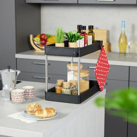 Endlich Ordnung unter dem Waschbecken! 🤗 Dieses praktische Regal von Relaxdays sorgt für System im Chaos. Mit zwei ausziehbaren Etagen hast du Putzmittel, Shampoos und Co. immer griffbereit. Die vier Haken sind perfekt für Schwämme oder kleine Küchenutensilien, und die beiden Becher bieten extra Stauraum für Bürsten oder Zahnpastatuben. Aus robustem PP-Kunststoff und Edelstahl, in reinem Weiß - passt super in Bad oder Küche. Einfach zusammenstecken, ohne Werkzeug! Maße: 42,5 x 22 x 40 cm, jede Ablage trägt bis zu 4 kg. Auch für Speisekammer oder Büro geeignet. Mach deinen Unterschrank zur Ordnungs-Oase!
