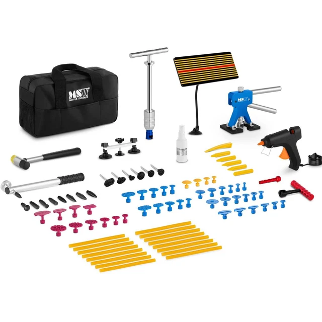 Kleine Dellen im Auto? Dieses professionelle 78-teilige Set macht dich zum Dellen-Experten! Enthält goldene Ausbeulzange, Brückenzange, T-Bar-Hammer, Heißklebepistole mit 10 Sticks, 40 Klebestreifen und vieles mehr. Die lackfreie Methode beschädigt deinen Originallack nicht - der Heißkleber lässt sich rückstandslos entfernen. Perfekt für kleine und tiefe Dellen an Türen, Kotflügeln oder auch Kühlschränken. Mit detaillierter Anleitung - auch für Anfänger geeignet. Spare teure Werkstattkosten und repariere Dellen selbst!