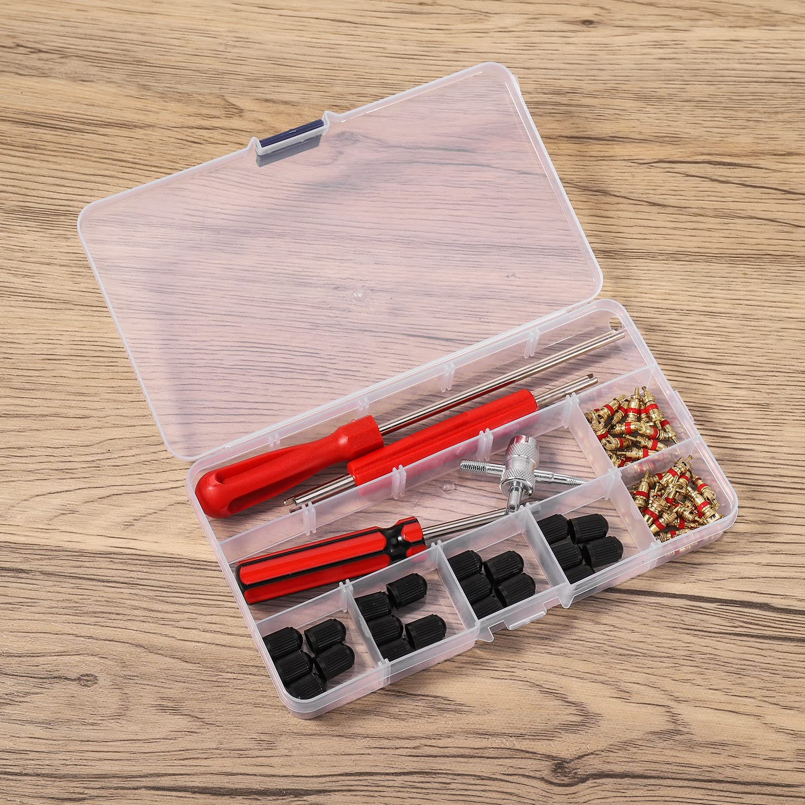 Platte Reifen? Nicht mit unserem Ventil-Reparatur Set! Das 88-teilige Toolkit von Sinofort hat alles, was du für die Ventilwartung an Auto, Motorrad oder Fahrrad brauchst. In der praktischen Aufbewahrungsbox findest du 36 Ventilkappen, 36 TR414-Ventilkerne und verschiedene Werkzeuge zum einfachen Wechseln der Ventileinsätze. Der 4-in-1 Ventilentferner ist das Multitalent unter den Werkzeugen - damit demontierst du nicht nur Ventile, sondern kannst auch Gewinde nachschneiden und Ventile aufreiben. Die Einzel- und Doppelkopf-Ventilentferner aus robuster Aluminiumlegierung machen die Arbeit besonders komfortabel. Alles ist hochwertig verarbeitet - die Ventilkerne aus Kupfer sorgen für lange Haltbarkeit, die Werkzeuggriffe liegen gut in der Hand. Perfekt für die Werkstatt, aber auch klein genug für den Handschuhfach. Egal ob du Profi oder Hobby-Schrauber bist - mit diesem Set meisterst du jede Ventilreparatur. Und das Beste: Passt für so gut wie alle Standard-Ventile! Immer griffbereit, immer vorbereitet.