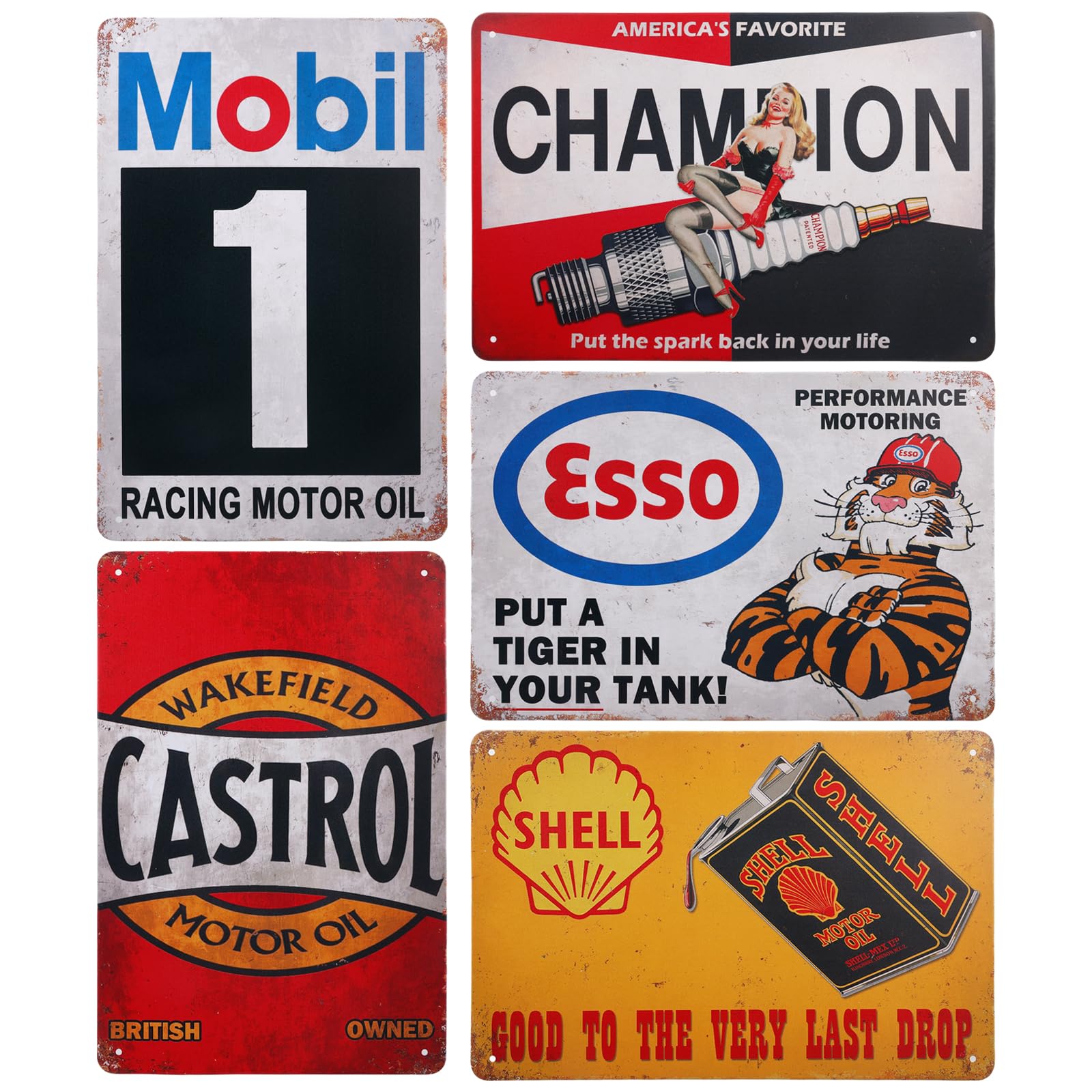 Bring Retro-Charme in deine vier Wände mit diesen coolen Vintage Metallschildern! Das 6er-Set zeigt klassische Automobil-Motive wie Schmieröl, Rennsport und Kraftstoff - genau der richtige Look für Garage, Werkstatt oder deine persönliche Man-Cave. Jedes Schild misst 20x30cm und ist aus robustem Blattblech gefertigt, das rostresistent und langlebig ist. Die bereits vorgebohrten Löcher machen das Aufhängen super einfach (Nägel nicht im Lieferumfang). Der verwitterte Look verleiht deinem Raum sofort diesen zeitlosen Automotive-Flair. Ob als Deko für die Hausbar, den Hobbyraum oder als Geschenk für Autofans - diese Schilder kommen immer gut an. Hol dir ein Stück Automobilgeschichte an die Wand!