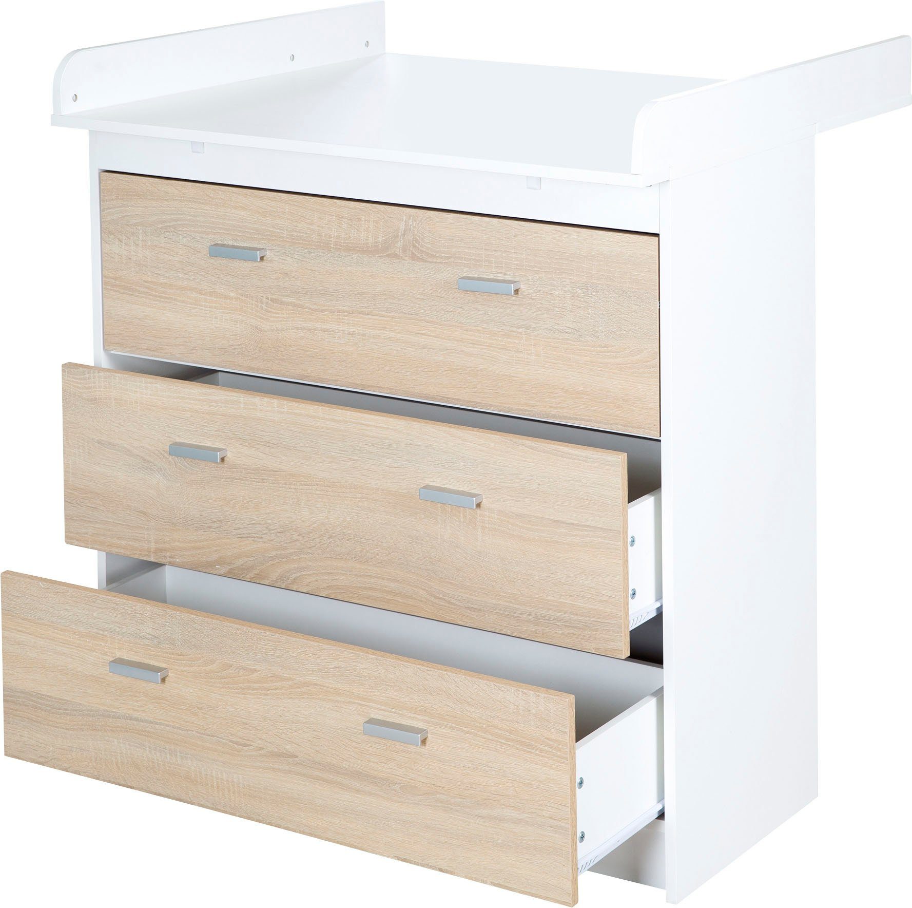 Wow, diese roba Wickelkommode 'Lion' ist ja mal der absolute Traum für jedes Babyzimmer! Im modernen Design in Weiß mit schicken Eiche-Dekor-Elementen - das sieht einfach klasse aus. Mit 93 cm Wickelhöhe ist sie total rückenschonend für dich als Elternteil. Und der Clou: Der Wickelaufsatz ist abnehmbar und kann links, mittig oder rechts montiert werden! Hinter den beiden Drehtüren und in den drei Schubladen findest du mega viel Stauraum für Windeln, Kleidung und all das Babyzeug, das man so braucht. Die Wickelfläche passt für Unterlagen bis 85x75 cm und ist super gemütlich gepolstert. Später, wenn das Wickeln vorbei ist, wird daraus eine ganz normale Kommode - ohne dass man doofe Schraubenlöcher sieht! Maße: 103 cm hoch, 117,5 cm breit, Tiefe mit/ohne Aufsatz 79/42 cm. Entspricht den Sicherheitsstandards EN 12221 und ist schadstoffgeprüft. Ein Möbelstück, das richtig lange mitwächst - erst Wickelplatz, dann Sitzkommode fürs Anziehen und später Aufbewahrungsmöbel für Teenager. Einfach perfekt durchdacht!