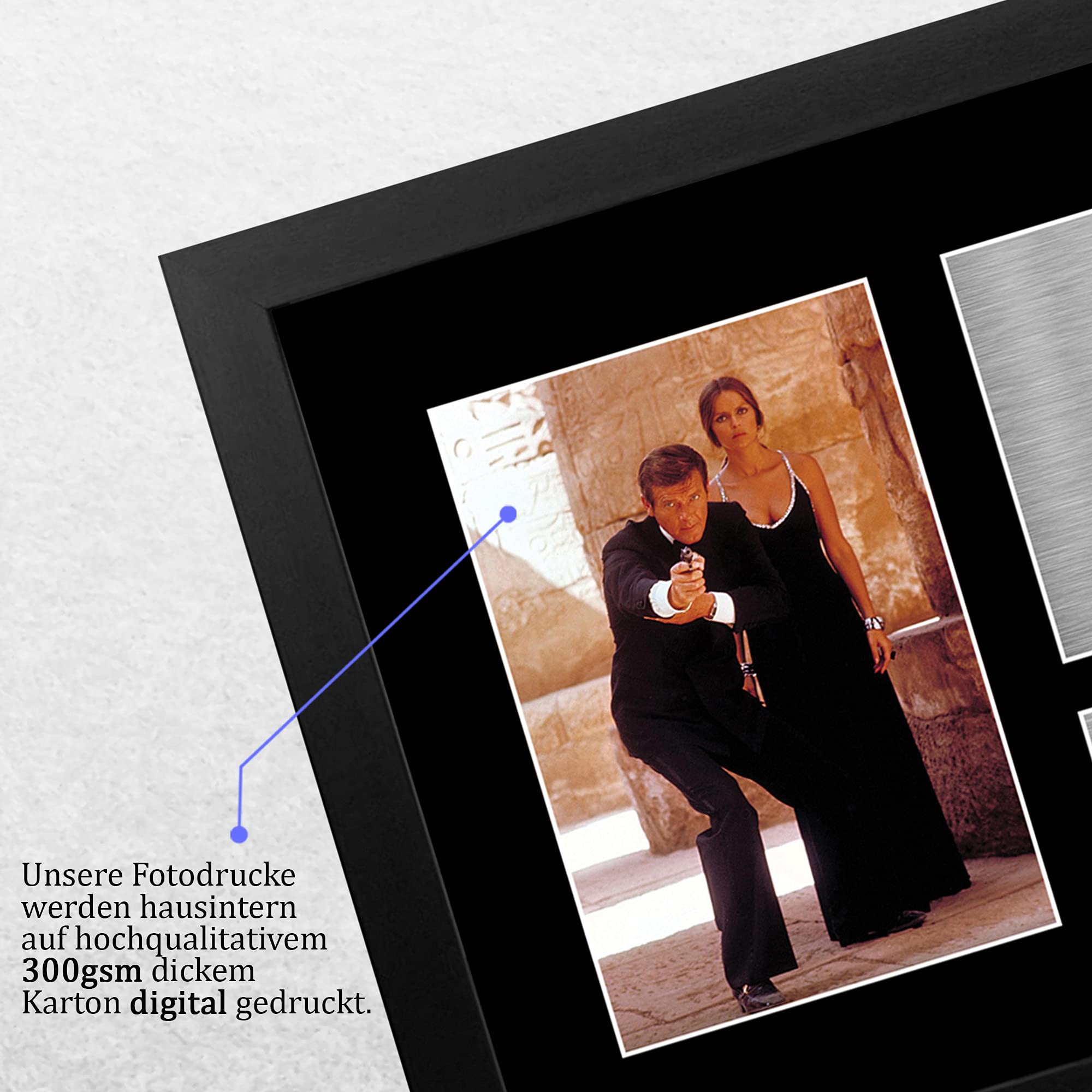 Ein Muss für alle James Bond Fans! Dieses stylische A4-Bild zeigt den unvergessenen Roger Moore in seiner ikonischen Rolle als 007. Professionell gerahmt in einem schlanken, schwarzen Polycarbonat-Rahmen mit mattschwarzem Passepartout. Das gedruckte Autogramm auf metallisch glänzendem Schild sieht täuschend echt aus! Perfekt als Geschenk für Geburtstage, Weihnachten oder einfach so für Bond-Liebhaber. Kommt fertig gerahmt und sofort aufhängebereit - einfach auspacken und an die Wand! Die hochwertige Verarbeitung und das authentische Design machen dieses Bild zu einem echten Hingucker. Ob im Wohnzimmer, Homeoffice oder der Film-Sammlung - hier kommt Bond-Feeling auf!