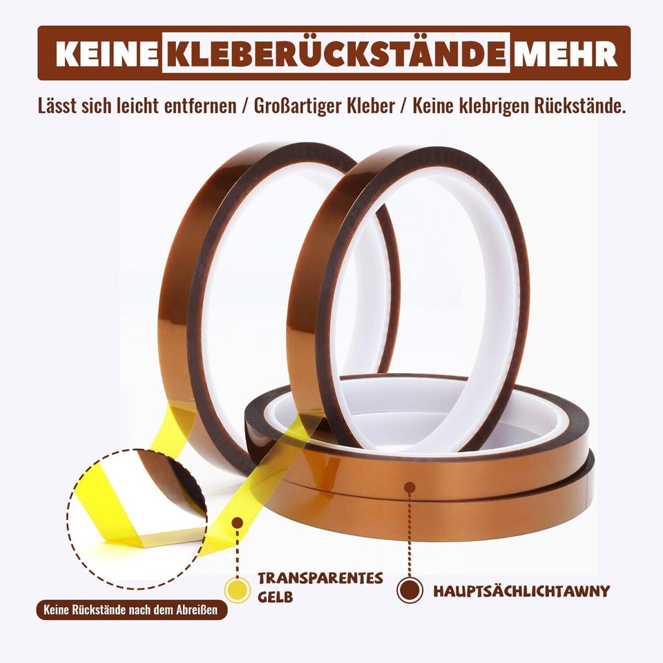 Boah, dieses Hitzeband ist vielseitig! Hält bis zu 250°C aus und hinterlässt absolut keine Klebereste. Perfekt für Sublimation auf Tassen, T-Shirts oder Stoffen. Mit 12mm Breite und 33m Länge pro Rolle hast du genug Material für viele Projekte. Das braune Polyesterband ist super flexibel und passt sich auch unebenen Flächen an. Ideal für Elektronikarbeiten, Leiterplatten oder Thermotransfer. Die 4 Rollen im Set reichen ewig - ob für DIY-Projekte oder professionelle Anwendungen. Einfach zuschneiden und anwenden! Kein ärgerliches Rückstände-Entfernen mehr. Das Band ist richtig reißfest und dehnt sich nicht. Absolut empfehlenswert für alle Kreativen und Heimwerker!