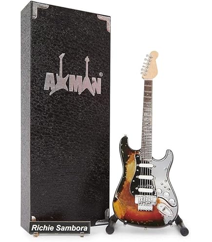 Ein absolutes Must-Have für jeden Gitarren-Fan! Diese Jim Root Miniatur-Gitarre ist ein detailgetreues Sammlerstück in 25cm Größe. Aus Holz mit Kunststoff- und Metalldetails sieht sie aus wie das Original - nur eben kleiner. Komplett mit Präsentationsständer und Display-Box, perfekt fürs Regal oder die Vitrine. Das Künstler-Namensschild macht das Gesamtbild komplett. Achtung: Nur zur Dekoration, nicht bespielbar! Das ideale Geschenk für Geburtstage, Weihnachten oder einfach so für alle, die Musik lieben. Sieht einfach mega cool aus und zeigt sofort, dass hier ein echter Kenner am Werk ist!
