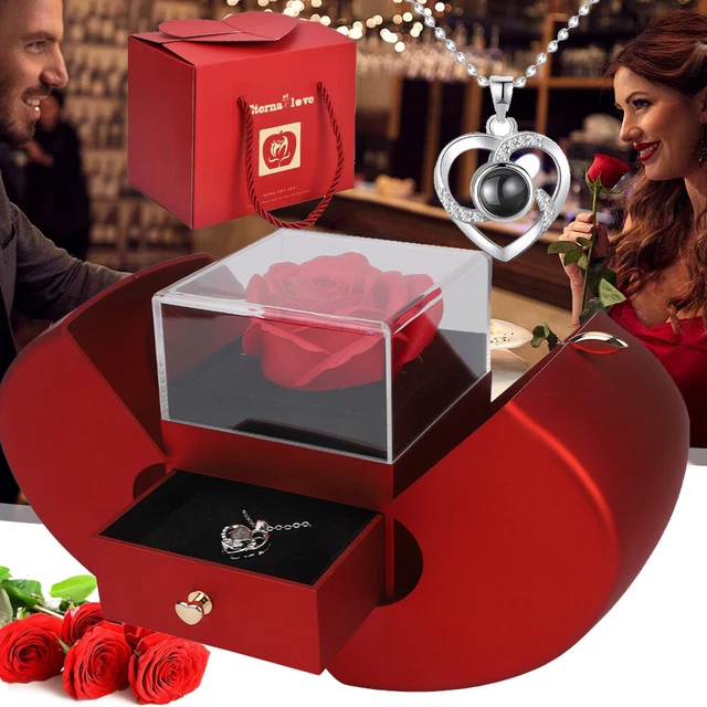 Wow, diese ewige Rose ist einfach magisch! Stell dir vor: Eine echte Rose, die durch ein Spezialverfahren jahrelang frisch und schön bleibt - ganz ohne Gießen oder Pflege. Das Besondere: Sie ist in anmutiger Herzform arrangiert und kommt mit einer zarten, abnehmbaren Halskette. Perfekt verpackt in einer hochwertigen Schmuck-Geschenkbox, die du sofort überreichen kannst. Egal ob zum Valentinstag, Muttertag, Weihnachten oder Jubiläum - dieses Geschenk trifft immer ins Herz! Die Rose symbolisiert unvergängliche Liebe und ist ein bleibendes Andenken an besondere Momente. Praktisch: Die Halskette ist einziehbar und kann individuell getragen werden. So hast du nicht nur eine wunderschöne Deko, sondern auch ein stylisches Accessoire. Ideal für Frauen, Mütter, Omas und Geliebte, die sich über eine emotionale Überraschung freuen. Die konservierte Rose behält ihre natürliche Schönheit ohne jegliche Pflege - ein echter Hingucker für die Ewigkeit!