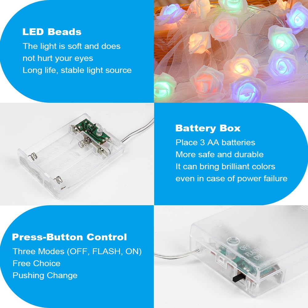 Verwandle dein Zuhause in ein romantisches Märchenreich mit dieser wunderschönen Rosen-Lichterkette! Auf 3 Metern Länge verteilen sich 20 warme LED-Lichter, jeweils umgeben von einer zarten 4cm Schaumstoffrose. Die Rosen leuchten in Weiß, Rosa und Rot - ein echter Hingucker! Mit zwei Lichtmodi: Dauerlicht oder sanftes Blinken für die perfekte Stimmung. Batteriebetrieben (3x AA, nicht im Lieferumfang) - völlig unabhängig von Steckdosen! IP43 geschützt, also auch für den Außenbereich geeignet. Perfekt fürs Schlafzimmer, Wohnzimmer, für Partys, Hochzeiten, Valentinstag oder Weihnachten. Ein traumhaftes Geschenk für Verliebte, Romantiker oder alle, die es gemütlich lieben! Einfach die Batterien einlegen und in eine bezaubernde Lichtwelt eintauchen. Die Lichterkette wird nie heiß und ist absolut sicher. Schaffe dir deine persönliche Wohlfühloase mit dieser magischen Rosenbeleuchtung!