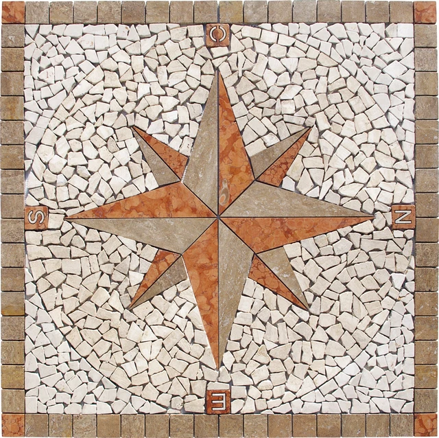 Antikmarmor Rosone 66x66 Cm - Windrose Mosaik Naturstein Grau Creme