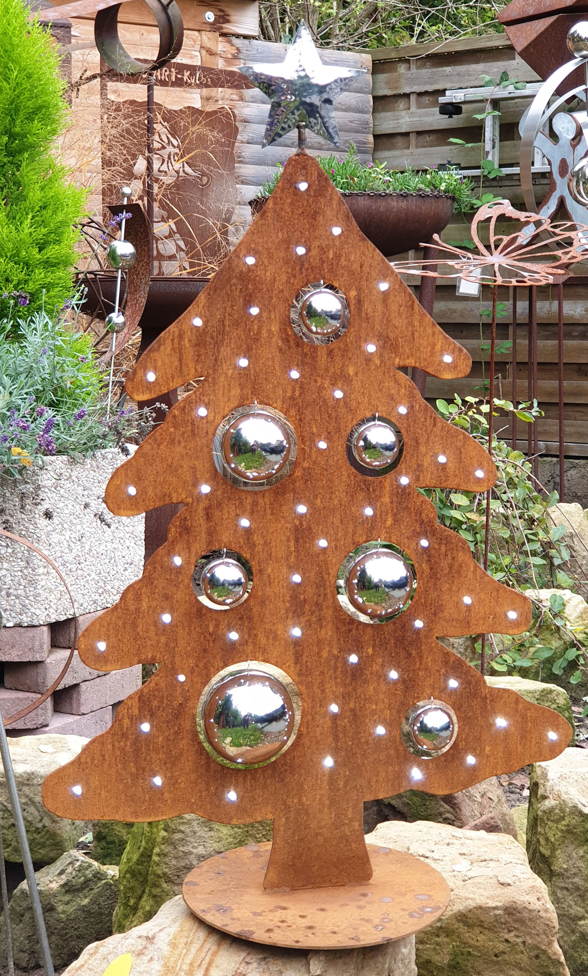 Bring rustikalen Weihnachtszauber in dein Zuhause! Dieser wunderschöne Tannenbaum aus Metall im Edelrost-Look ist ein echter Hingucker. Mit 50cm Höhe und 25cm Breite passt er perfekt auf jeden Tisch, Sideboard oder ins Fenster. Die stabile Bodenplatte (18cm Durchmesser) sorgt für sicheren Stand. Hergestellt in handwerklicher Qualität in Bayern - jedes Stück ein Unikat! Der natürliche Rost-Look passt perfekt zu Landhaus-, Industrie- oder modernem Einrichtungsstil. Wetterfest - kann draußen im Garten, auf der Terrasse oder drinnen im Wohnzimmer stehen. Ein tolles Geschenk für Weihnachtsfans oder alle, die es etwas anders mögen. Dekoriere ihn mit Lichterkette, Kugeln oder lass ihn pur wirken - beides sieht fantastisch aus! Mach deine Weihnachtsdeko dieses Jahr besonders und einzigartig - mit diesem rustikalen Schmuckstück wird's garantiert unvergesslich!