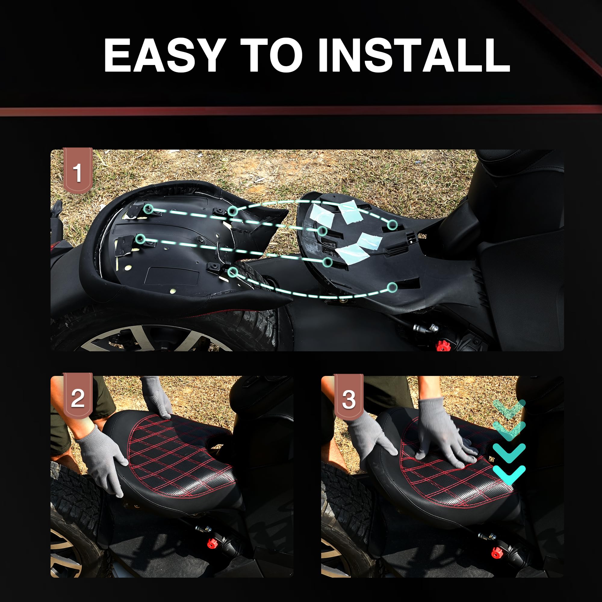 Und das Material ist richtig hochwertig - wetterfest, reißfest und hält auch mal was aus. Der Einbau ist total easy, du brauchst keinen Profi dafür. Einfach den alten Sitz ab, den neuen drauf und schon kannst du losdüsen! In schickem Schwarz mit roten Akzenten sieht er dazu noch mega stylisch aus. Dein Ryker wird damit zum richtigen Hingucker!